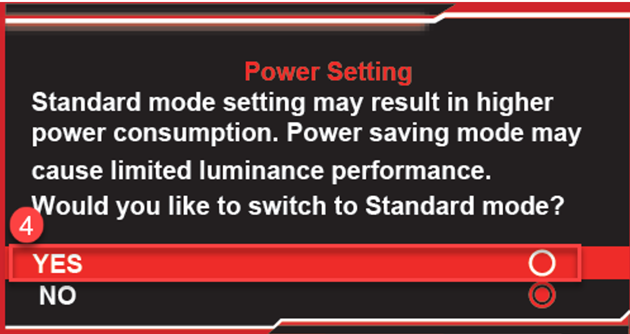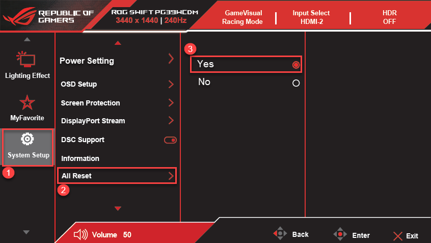 1.2 If switching to Standard Mode or High Performance Mode still causes the OSD (On-Screen Display) to be grayed out and unavailable, please perform All Reset.