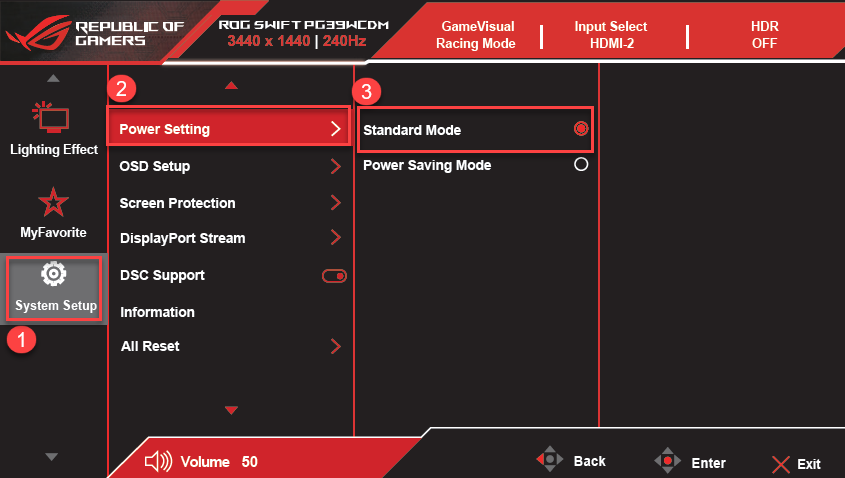 ① System Setup->② Power Setting->③ Standard Mode or High Performance Mode