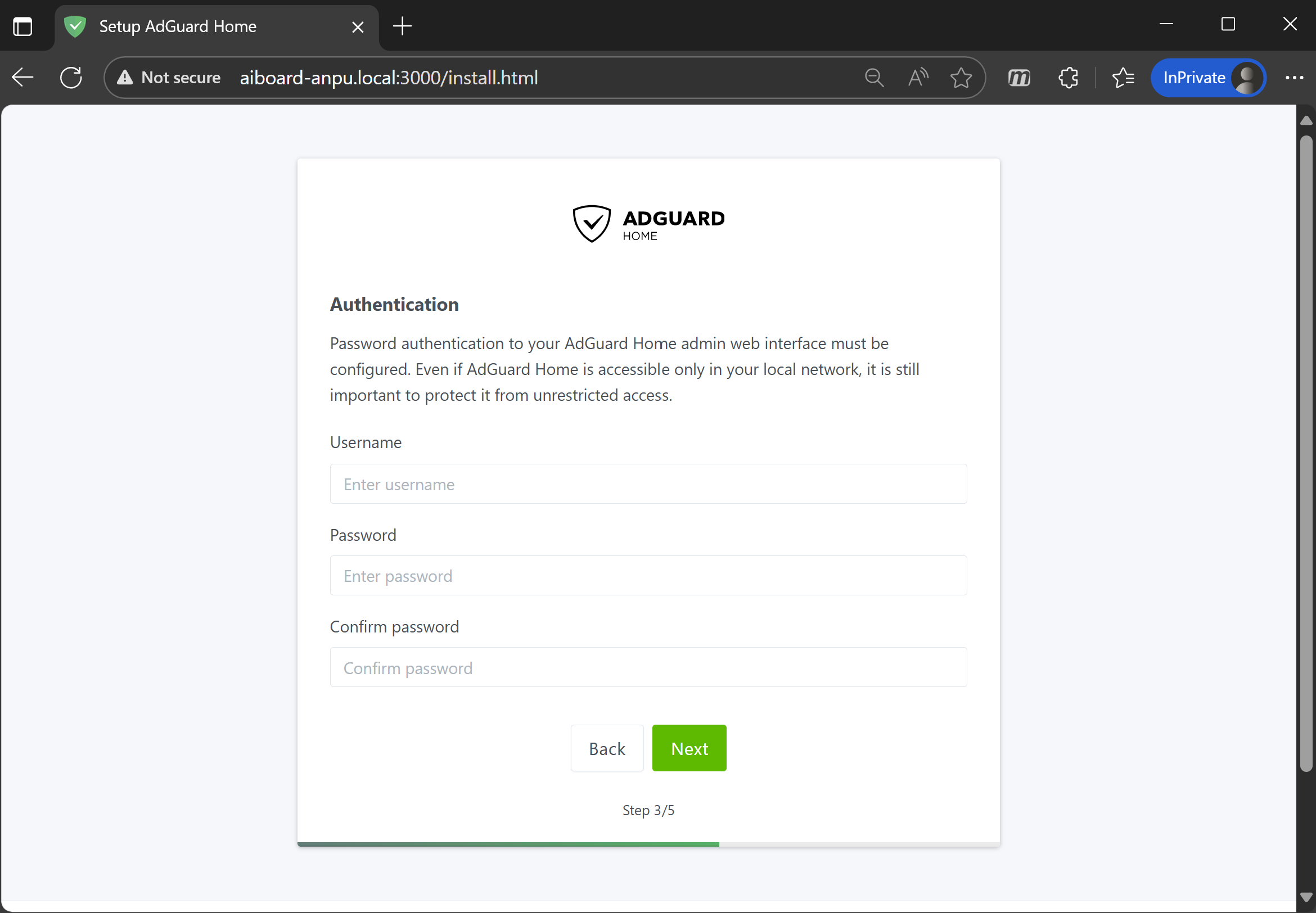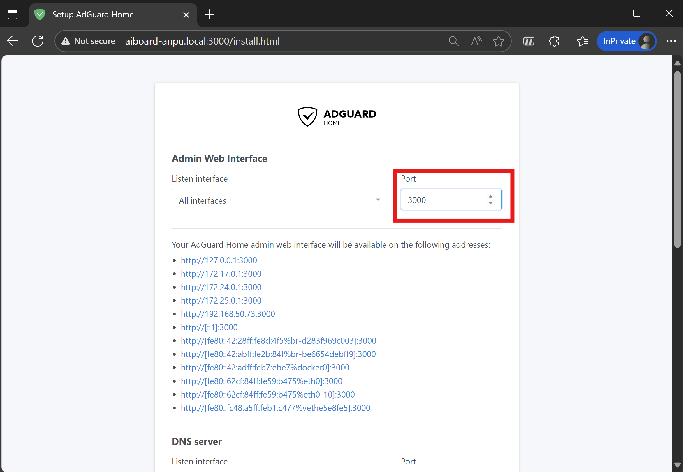 During installation, look for the hostname (e.g., aiboard-anpu.local) shown on the settings card at the bottom of the screen. You’ll use this address to connect to AdGuard Home later, so write it down.