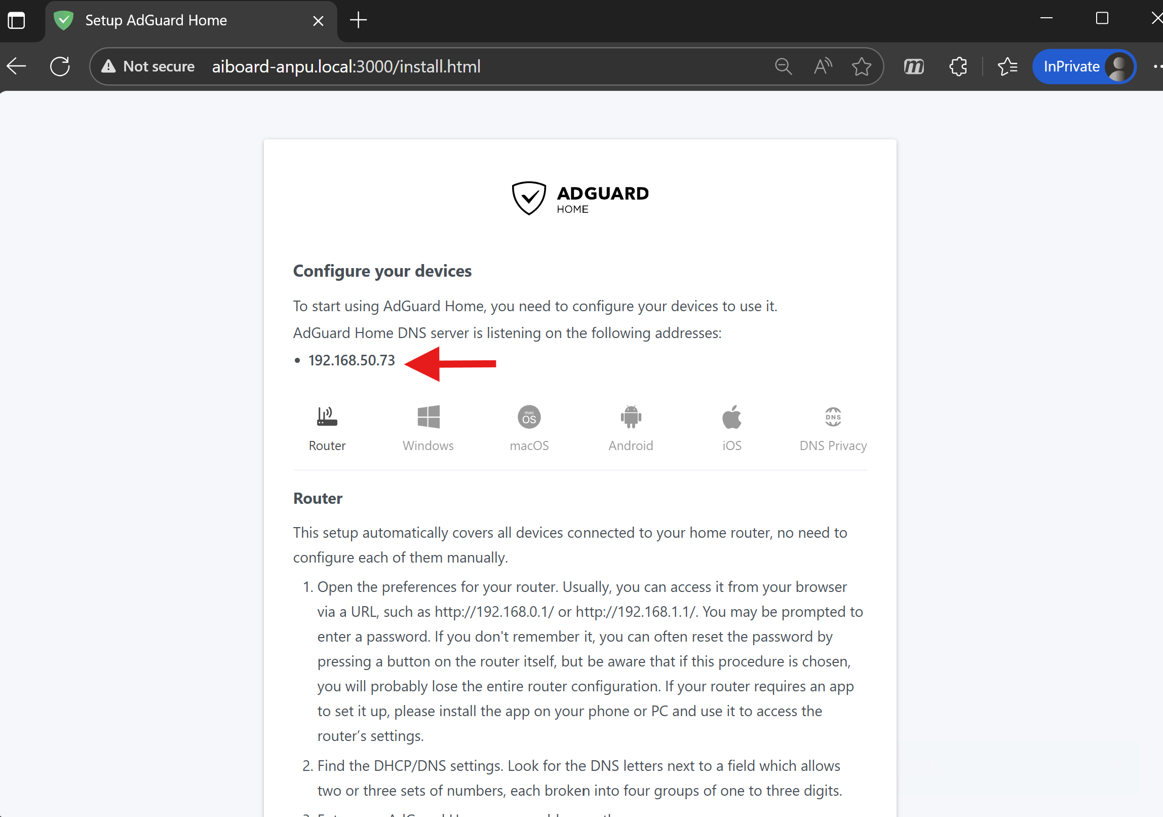 5. Note the AdGuard Home IP Address The setup will display the AdGuard Home IP. Write this down—you’ll need it for later steps.