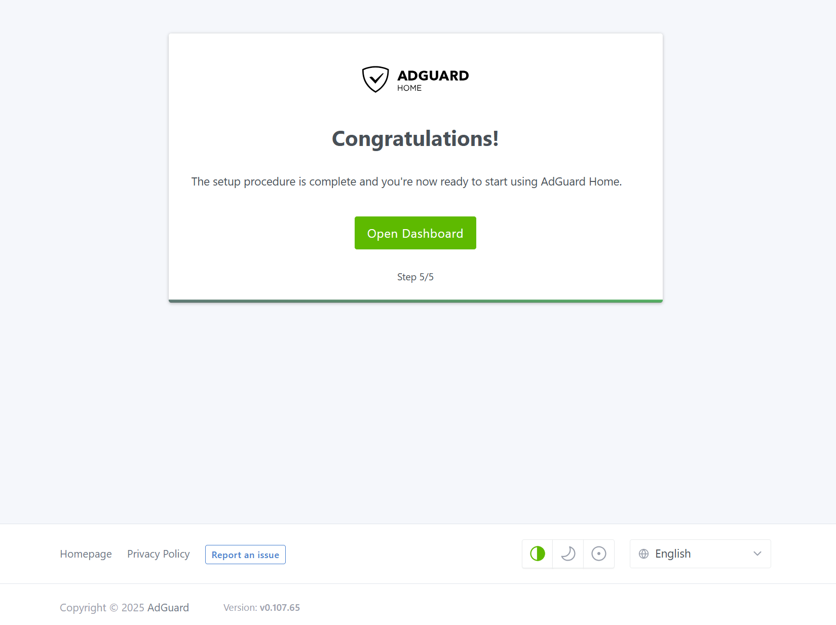 6. Finish Setup Congratulations! You’ve installed AdGuard Home and completed the initial setup. Next, we’ll personalize your settings.