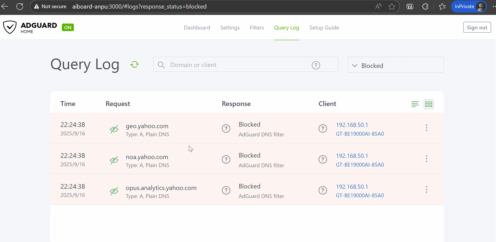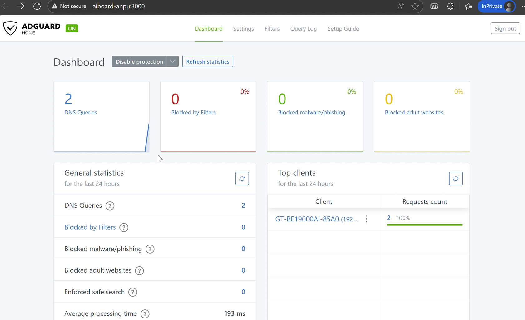 After completing this guide, you'll have a DNS server running on your AI router that can block ads and help keep your family safe online. Below are screenshots of the AdGuard Home dashboard and filtering settings you’ll see once setup is complete: