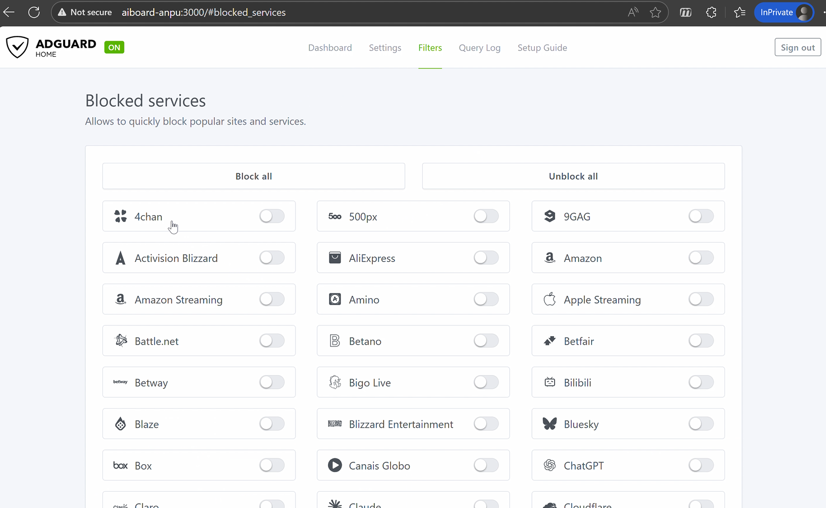 AdGuard Home offers a variety of filters. Go to [Filters] > [Blocked services] to block specific sites or services as needed.