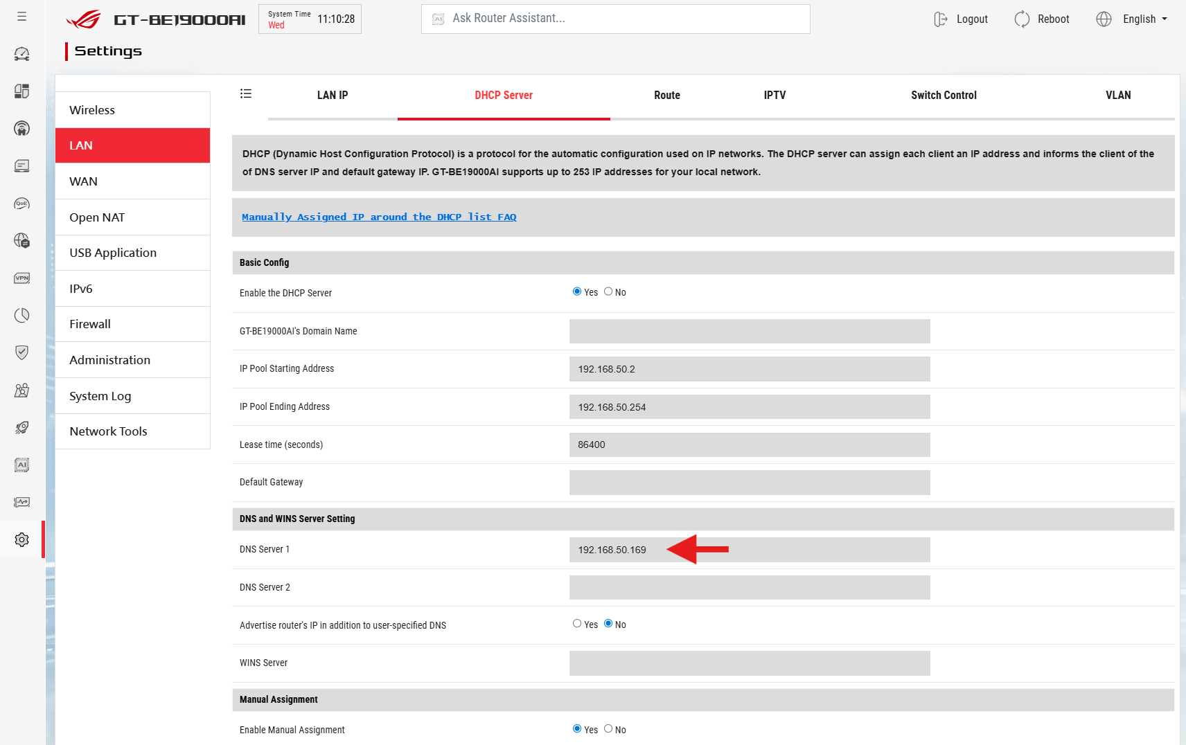 Go to your router’s LAN > DHCP Server > DNS and WINS Server Setting page. Set the DNS Server to the AdGuard Home IP you noted earlier. This way, all devices will automatically send DNS queries to AdGuard Home—no need to configure each one individually.