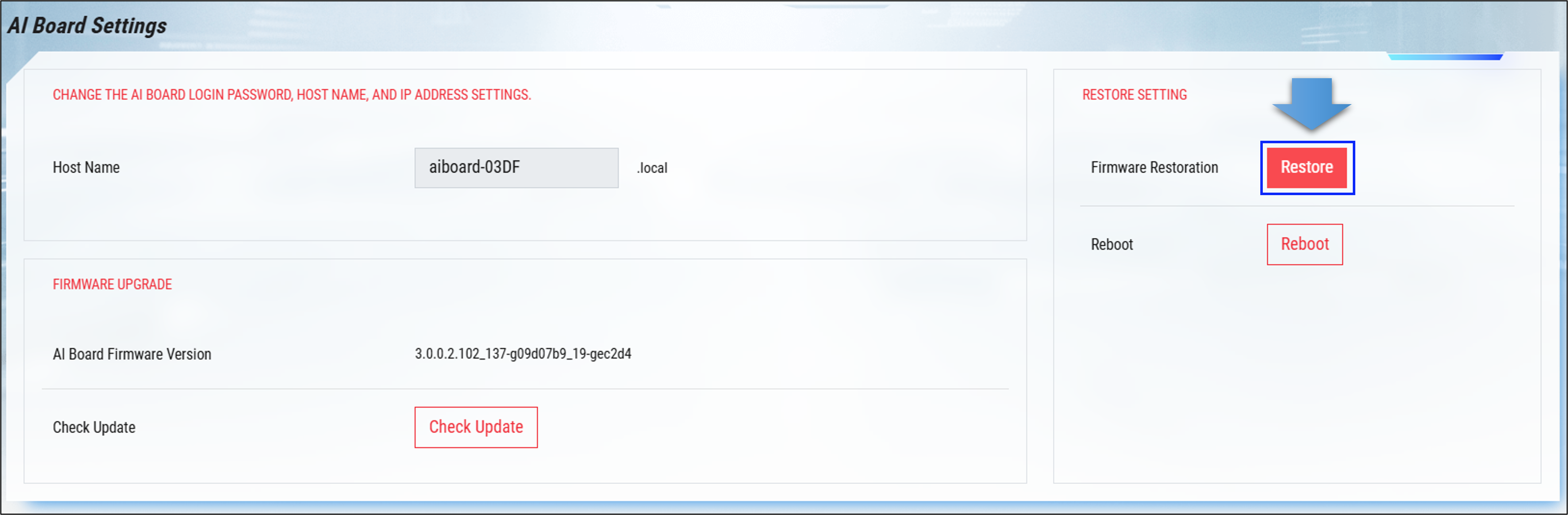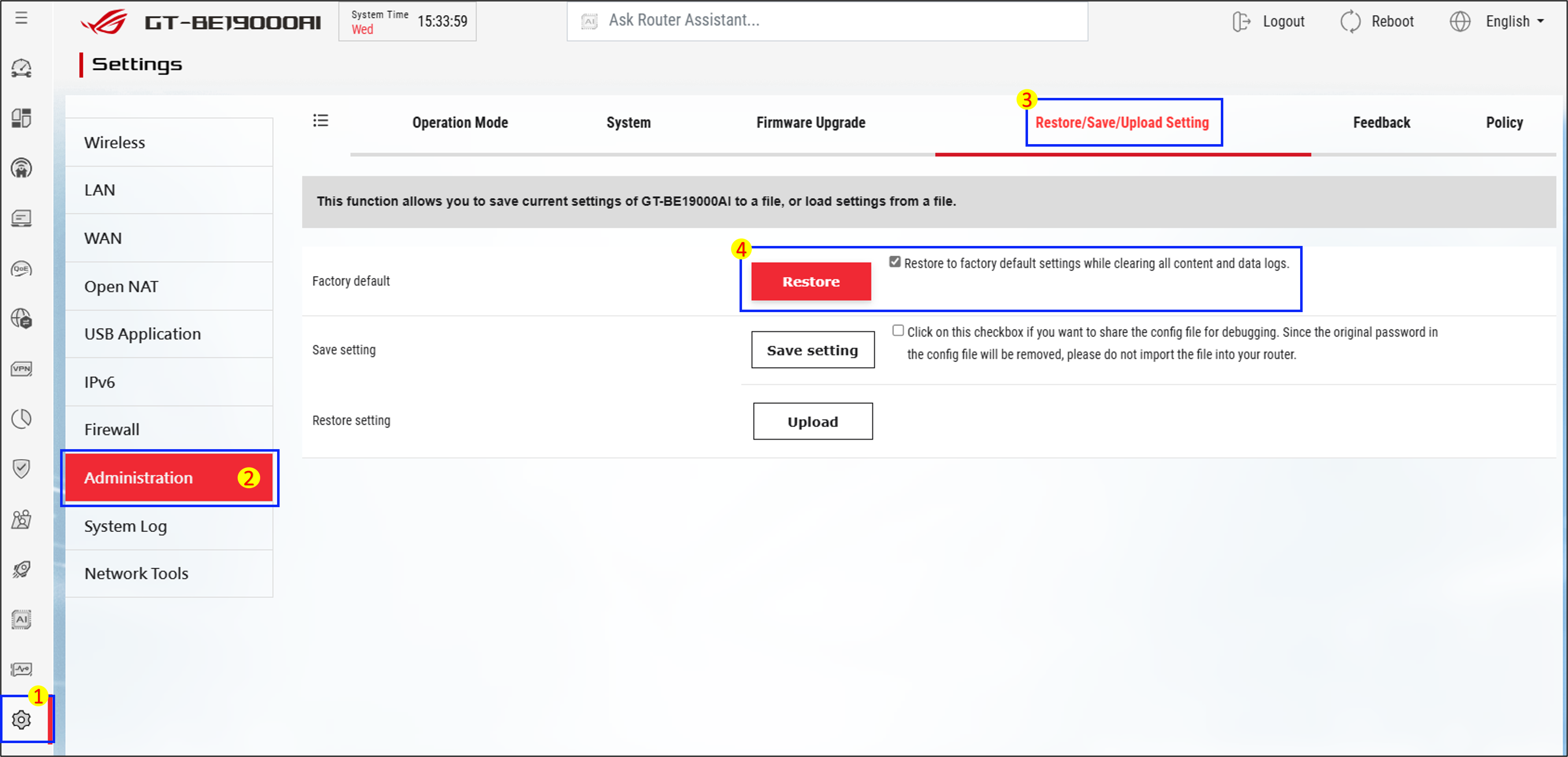 Go to Settings → Administration → Restore/Save/Upload Setting page, and click the [Restore] button. This will only reset the main router system; the Docker system on the AI board will not be affected. This is suitable if you want to clear router settings to avoid configuration conflicts, but wish to keep the AI board's settings. It is recommended to export your settings for backup before resetting.