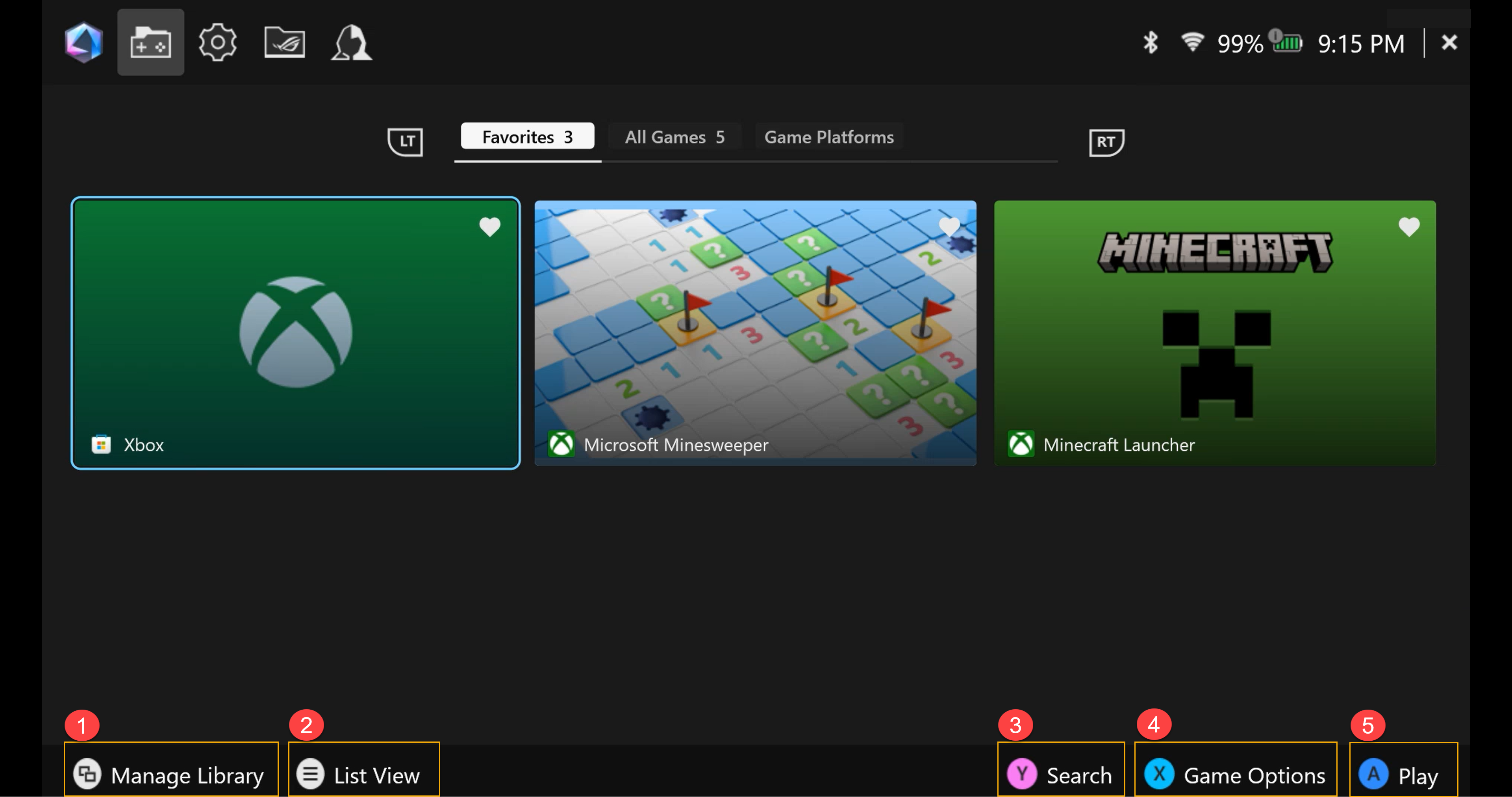 The main menu offers a view of your currently installed games and applications, with the ability to quickly launch them. Thru the trigger keys, user can switch page between Favorites and Game Platforms.