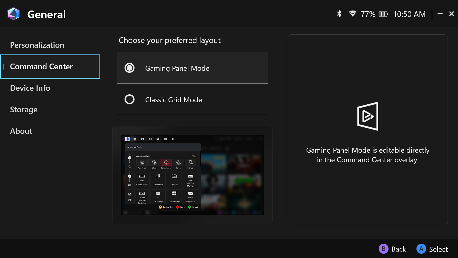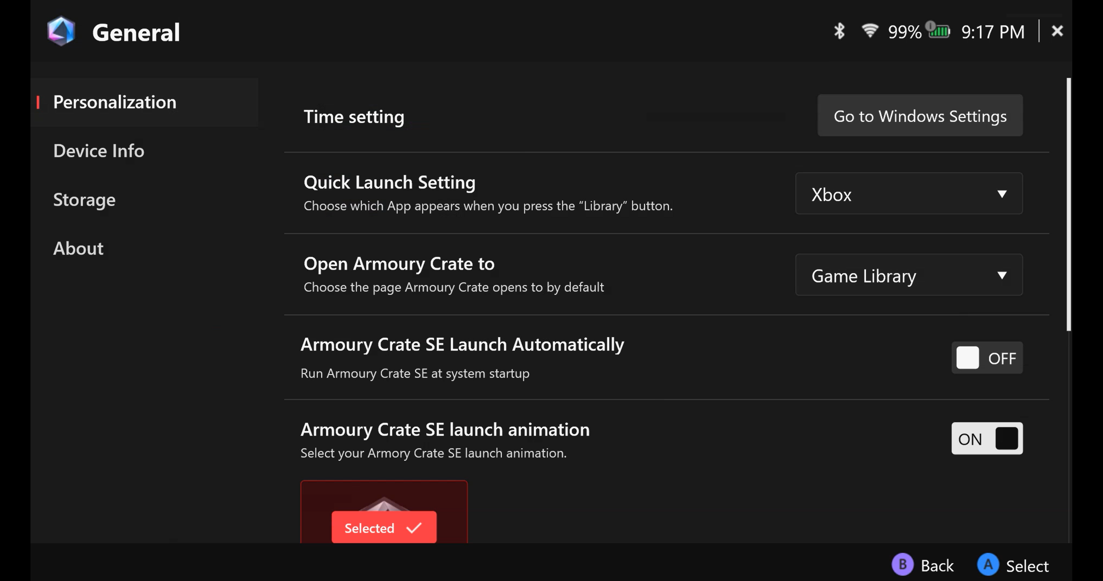 General: Players can customize the launch animation or interface theme of Armoury Crate SE in the personalization. Also, they can check the Device Info and their device storage. In the [About], the Armoury Crate SE version, Service Version, and App Diagnostics tool will be displayed.