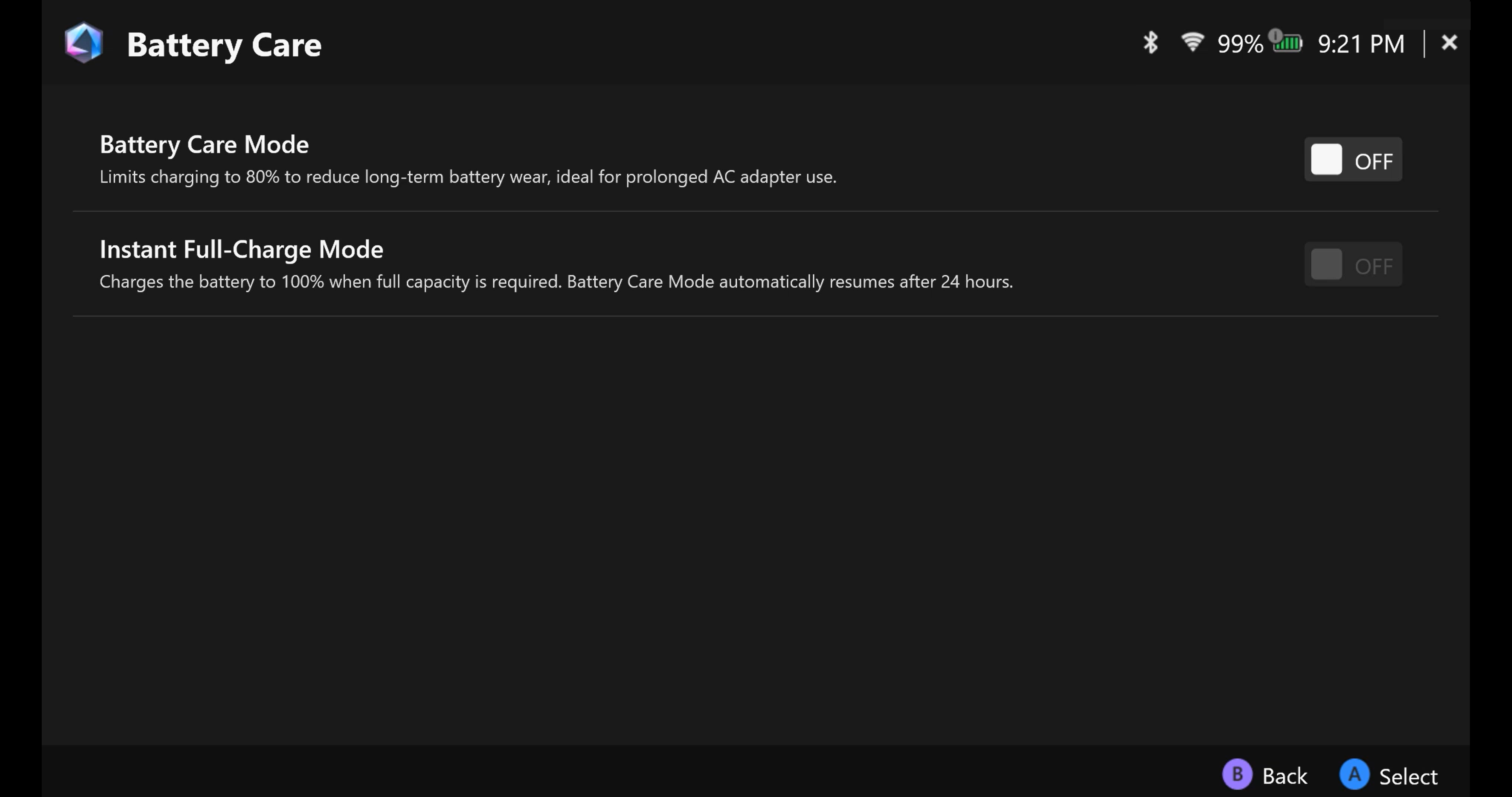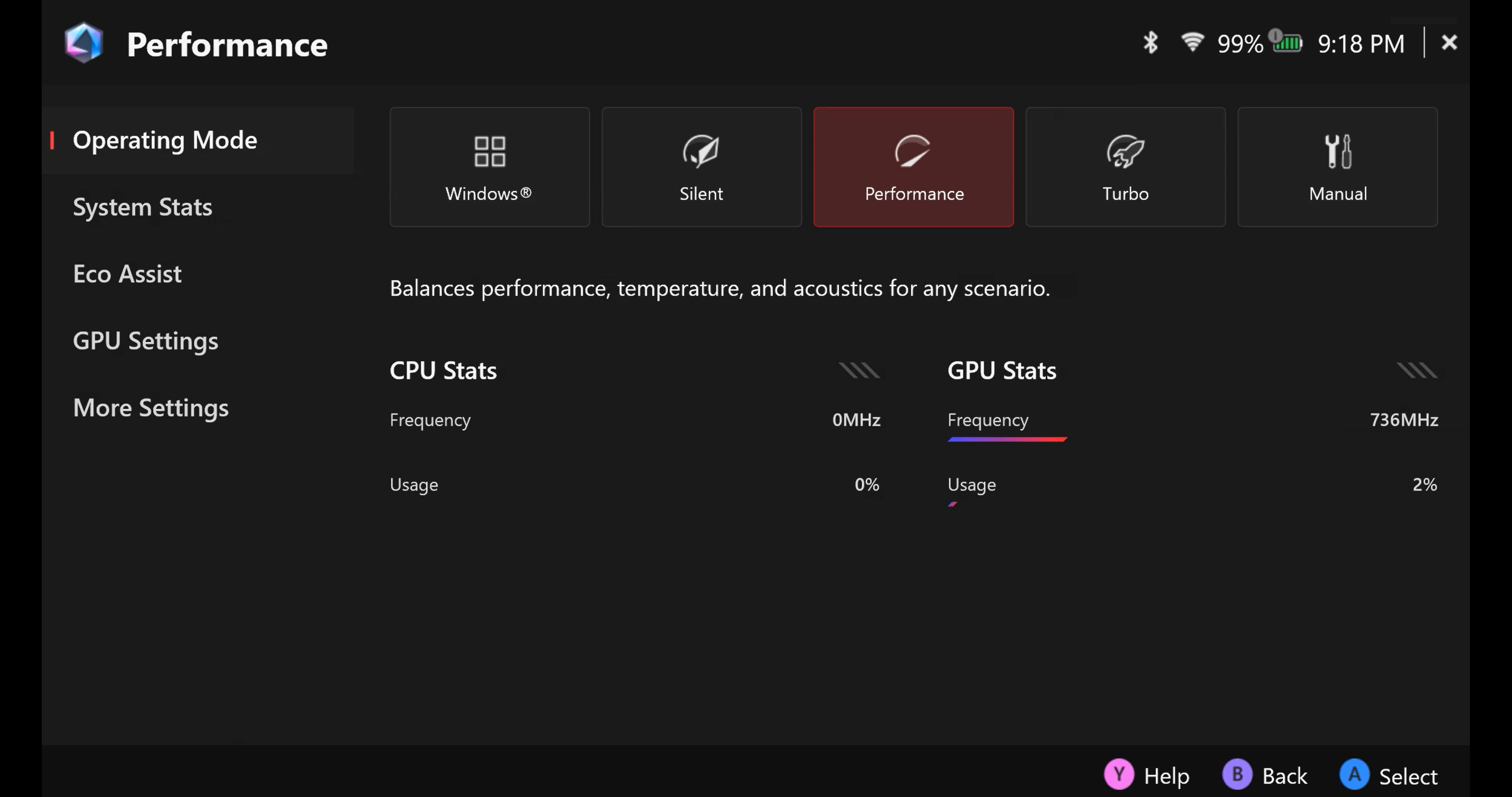 Performance: Provides multiple options to adjust system performance for any scenario. Additional Eco Assist and GPU Settings can also be adjusted in Performance.