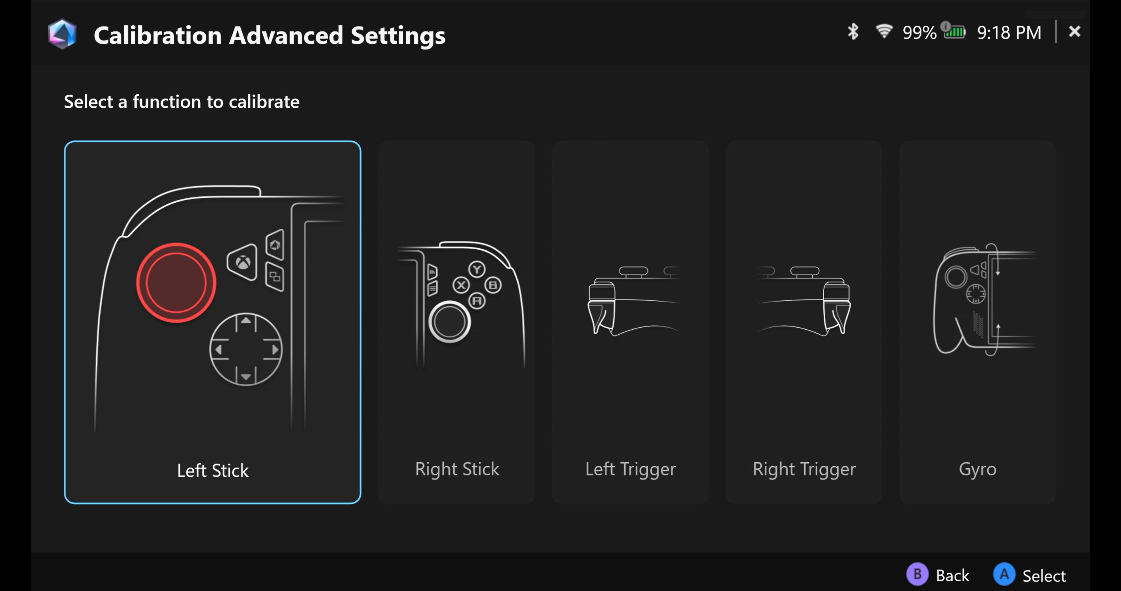 Calibration: Calibration advanced settings, select left/right stick, left/right trigger or Gyro to calibrate.