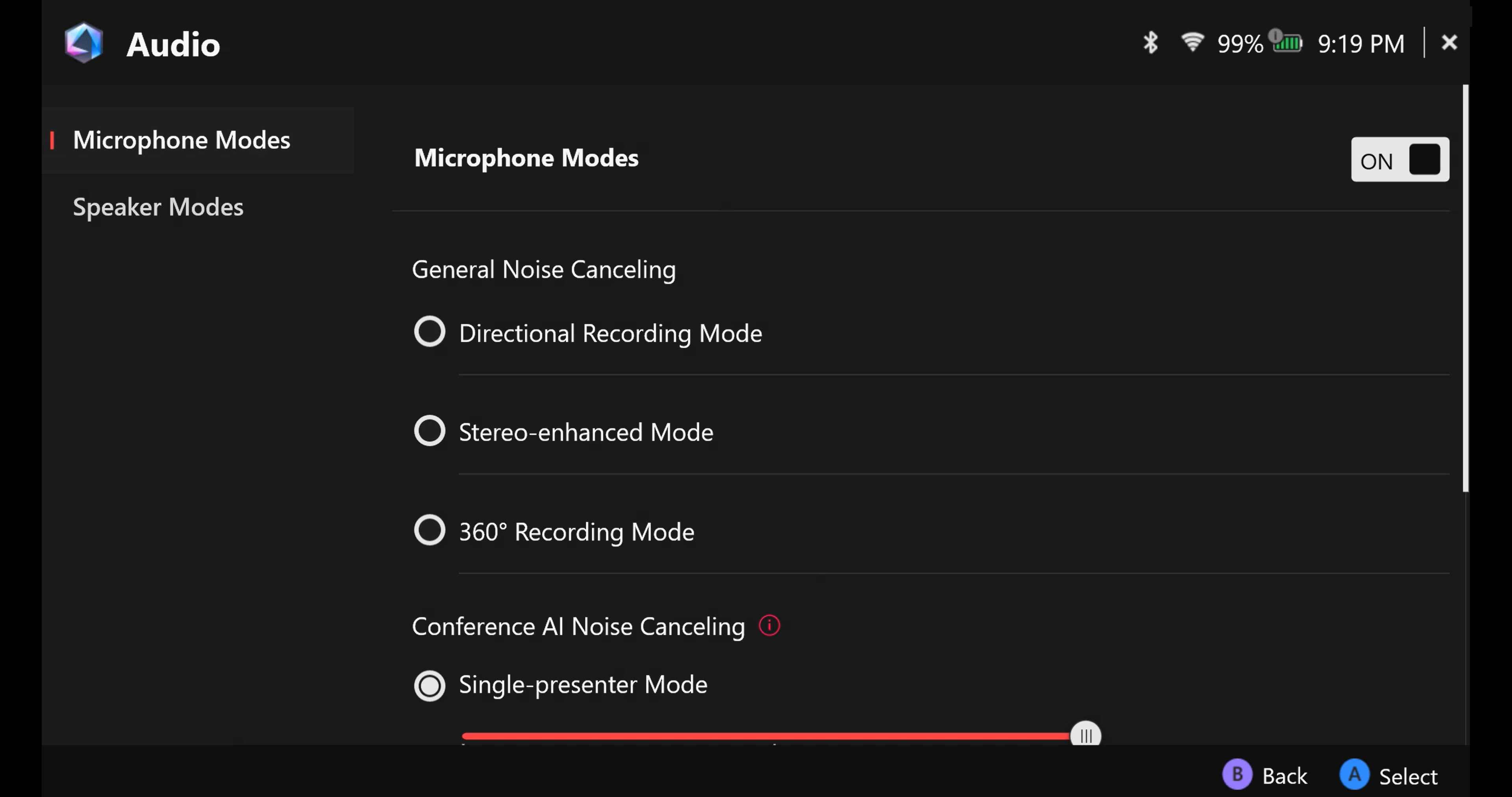 Audio: Select the desired microphone and speaker mode, and enable or disable the AI Noise-Canceling solutions.