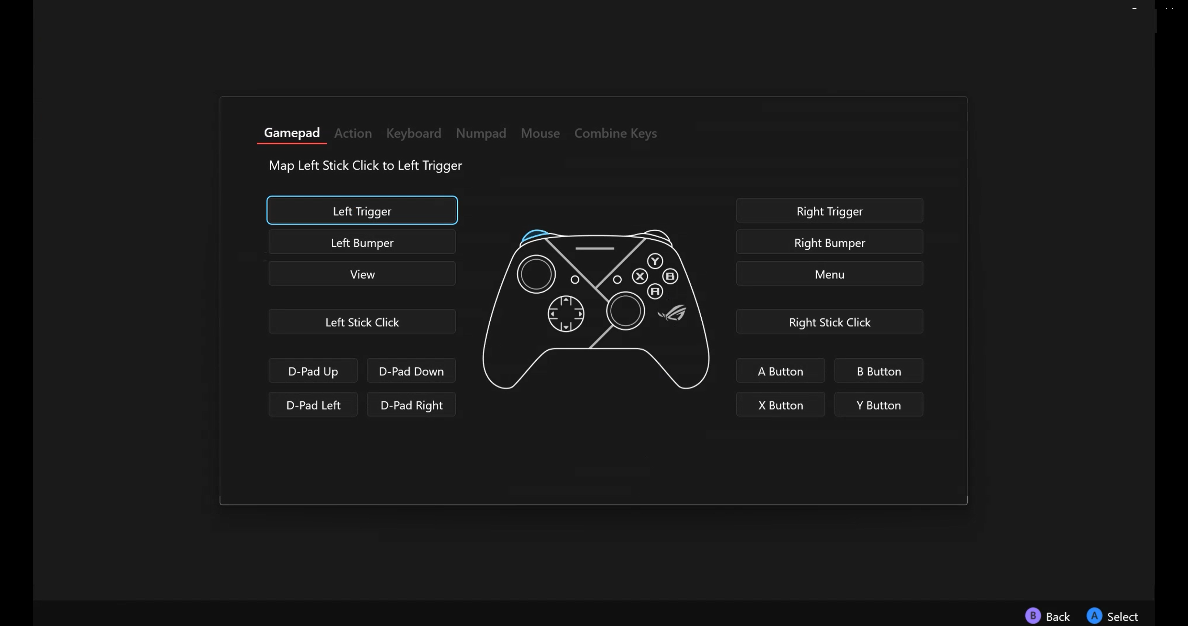 Button Function Setup: All mappable buttons can be customized as either a Gamepad, Action, Keyboard key, Numpad key, Mouse function, or Combination Keys function.