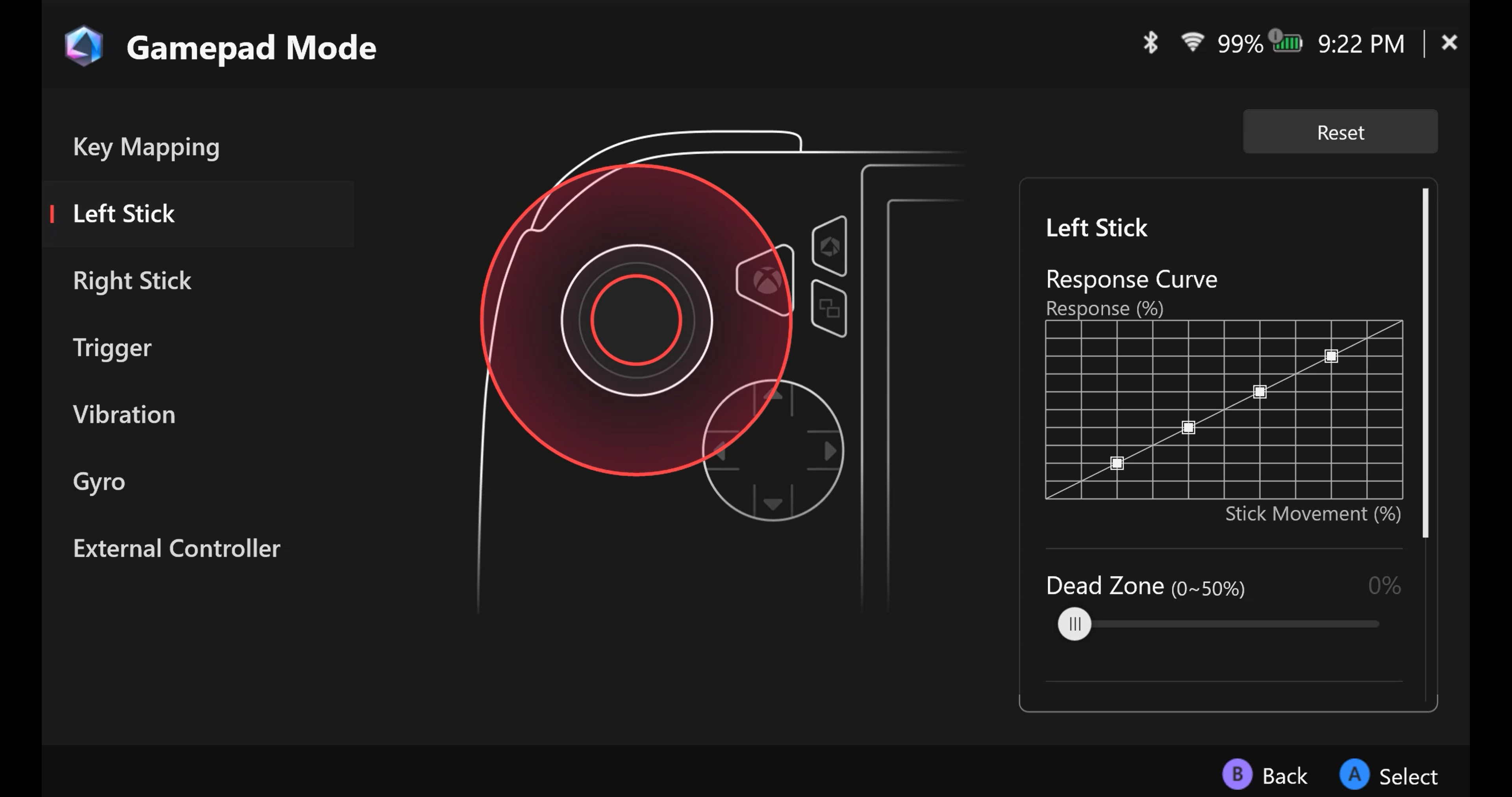 The joystick’s inner [Dead zone] and outer threshold are both fully configurable.