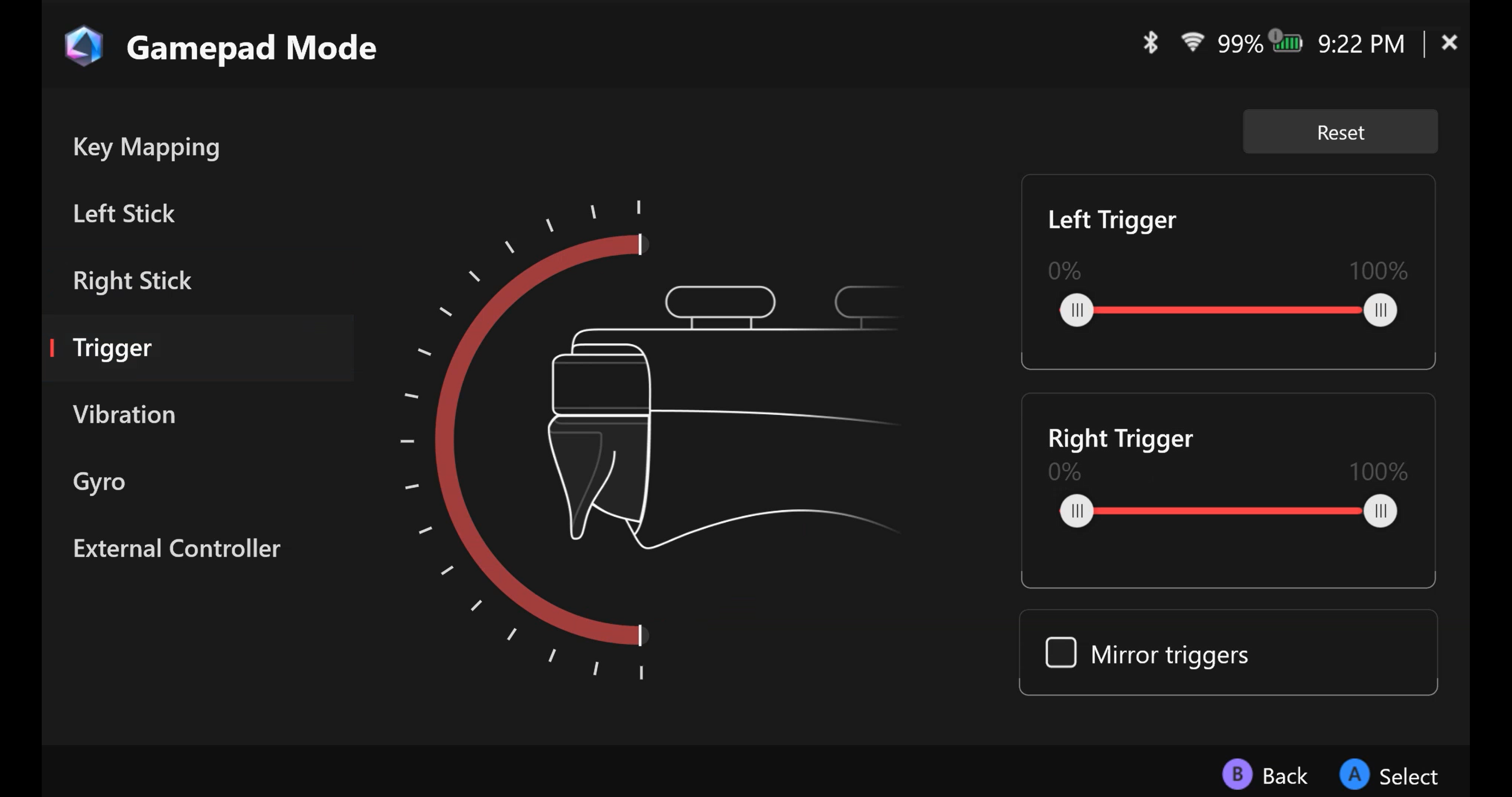 Trigger sensitivity can be customized individually, or select [Mirror triggers] to align both sensitivities.