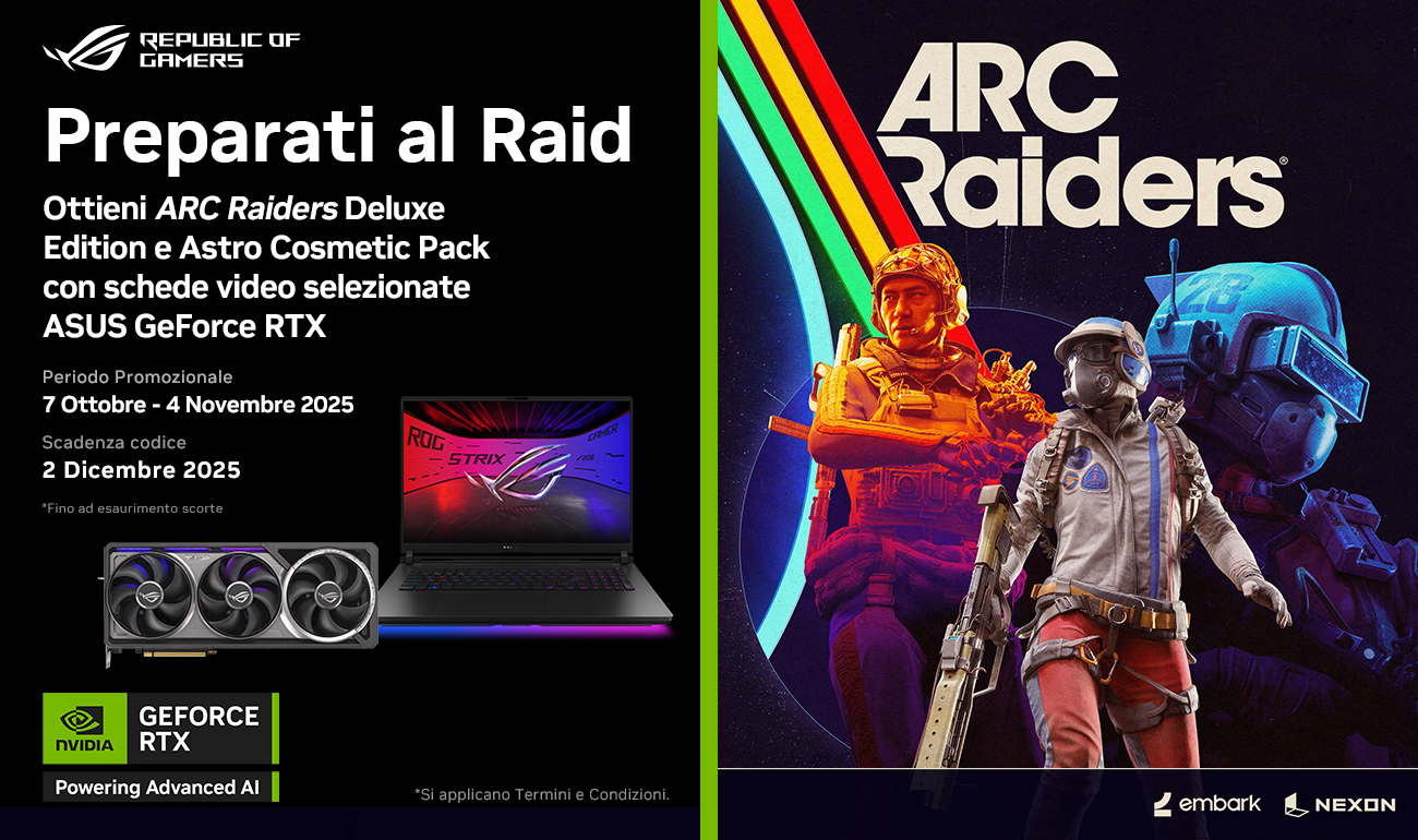 Solo per i modelli idonei. Periodo della promozione: dal 7 ottobre al 4 novembre 2025, salvo esaurimento scorte. L'offerta include un codice di download digitale (ARC Raiders). Un solo codice per cliente. Per riscattare il gioco è necessario avere la scheda grafica installata. Il cliente deve avere l'età minima richiesta per poter giocare. Requisiti del Paese: i coupon devono essere riscattati nei Paesi in cui è stato effettuato l'acquisto. Si prega di riscattare il codice nel Paese appropriato.