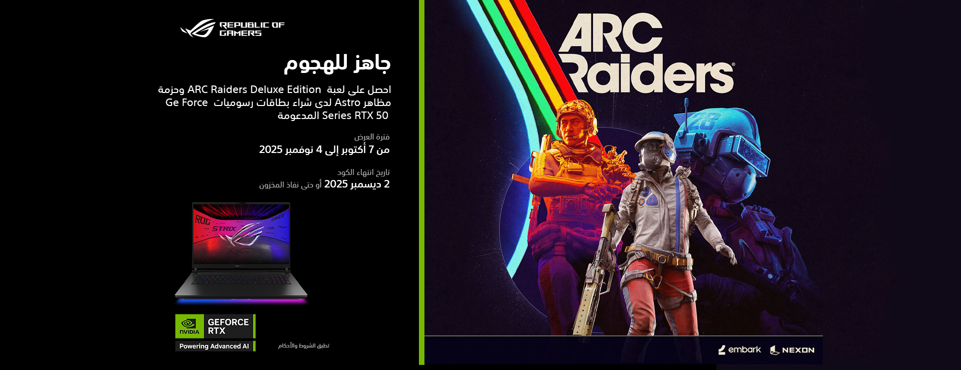 فقط للموديلات المؤهلة. فترة العرض: من 7 أكتوبر إلى 4 نوفمبر 2025، طوال فترة توفر المخزون. يشمل العرض رمز تحميل رقمي (ARC Raiders). رمز واحد فقط لكل عميل. لاسترداد اللعبة يجب أن تكون البطاقة الرسومية مثبتة. يجب أن يكون العميل في العمر الأدنى المطلوب للعب اللعبة. متطلبات الدولة: يجب استرداد القسائم في الدول التي تم فيها الشراء. يرجى استرداد الرمز في الدولة المناسبة.