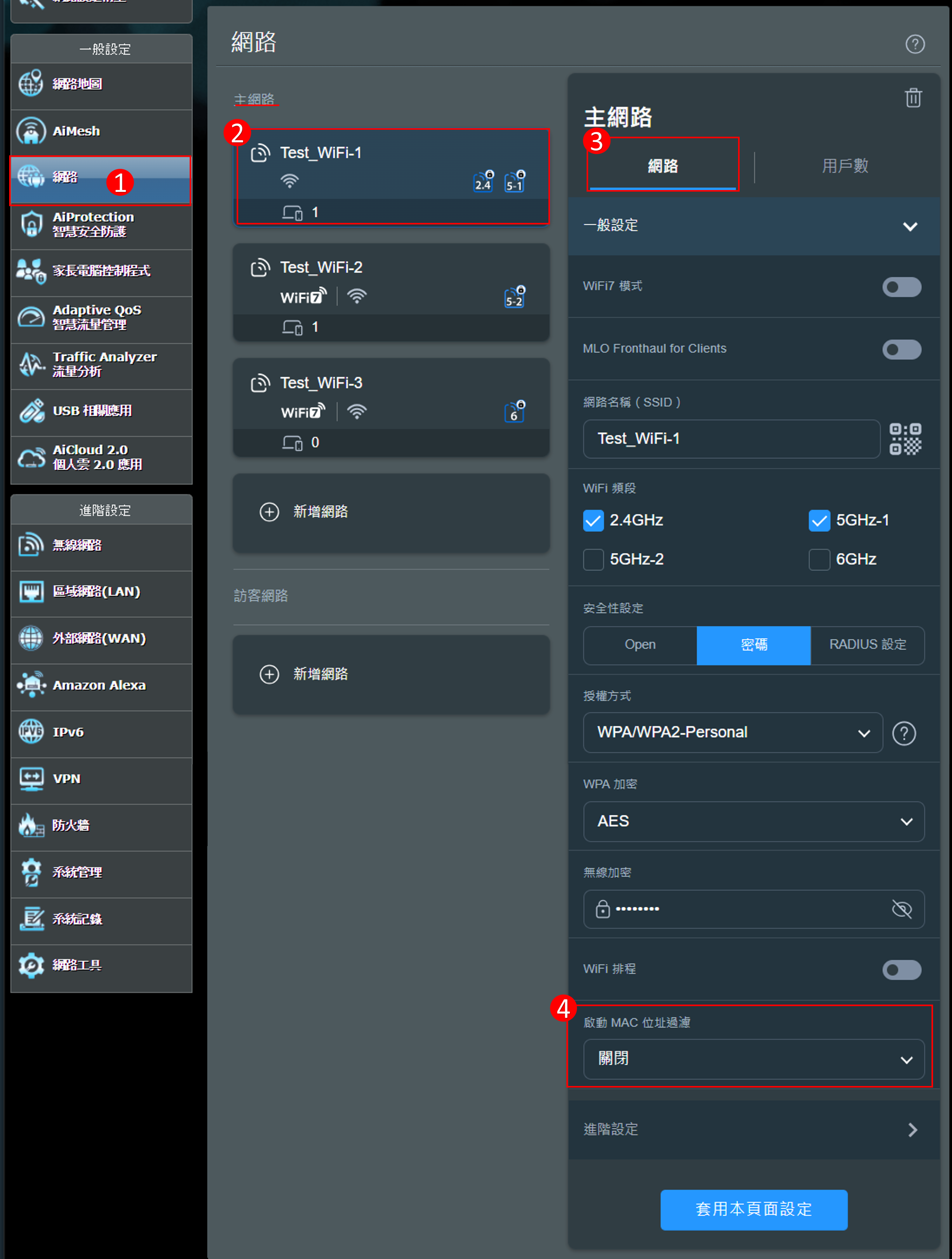 步驟1. 進入華碩路由器App,點擊[設定] > [網路] > [主網路設定檔](以下用Test_WiFi-1為範例) > 在啟動MAC 位址過濾 選擇[拒絕模式]或[拒絕模式] 。