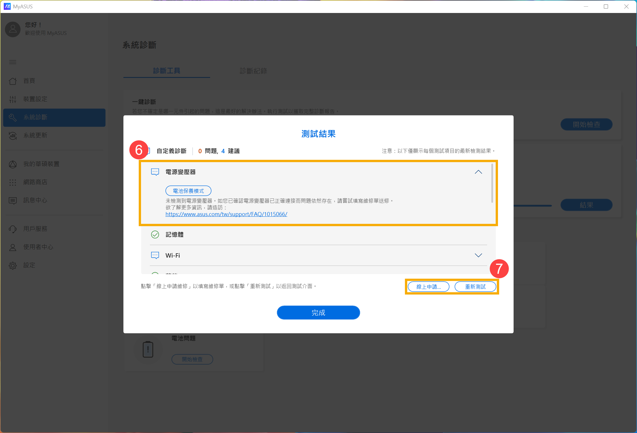 - 如果診斷結果出現有問題,將會列出問題項目及提供相對應的故障排除建議⑥。此外,如果有任何硬體錯誤,您還可以在此頁面發出維修單,或者您可以再次進行測試以進行錯誤的雙重檢查⑦。