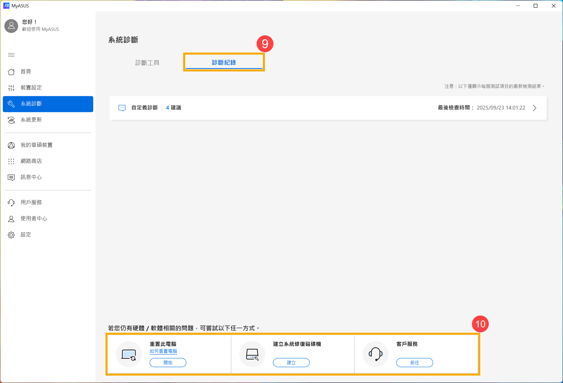 - 在診斷紀錄中⑨,您可以查看先前的診斷記錄,在此頁面上,您可以選擇重置此電腦、建立系統修復磁碟機或聯繫華碩客戶服務⑩。請點擊[如何重置電腦]以瞭解有關還原過程的介紹,或點擊[開始]以直接運行還原過程。