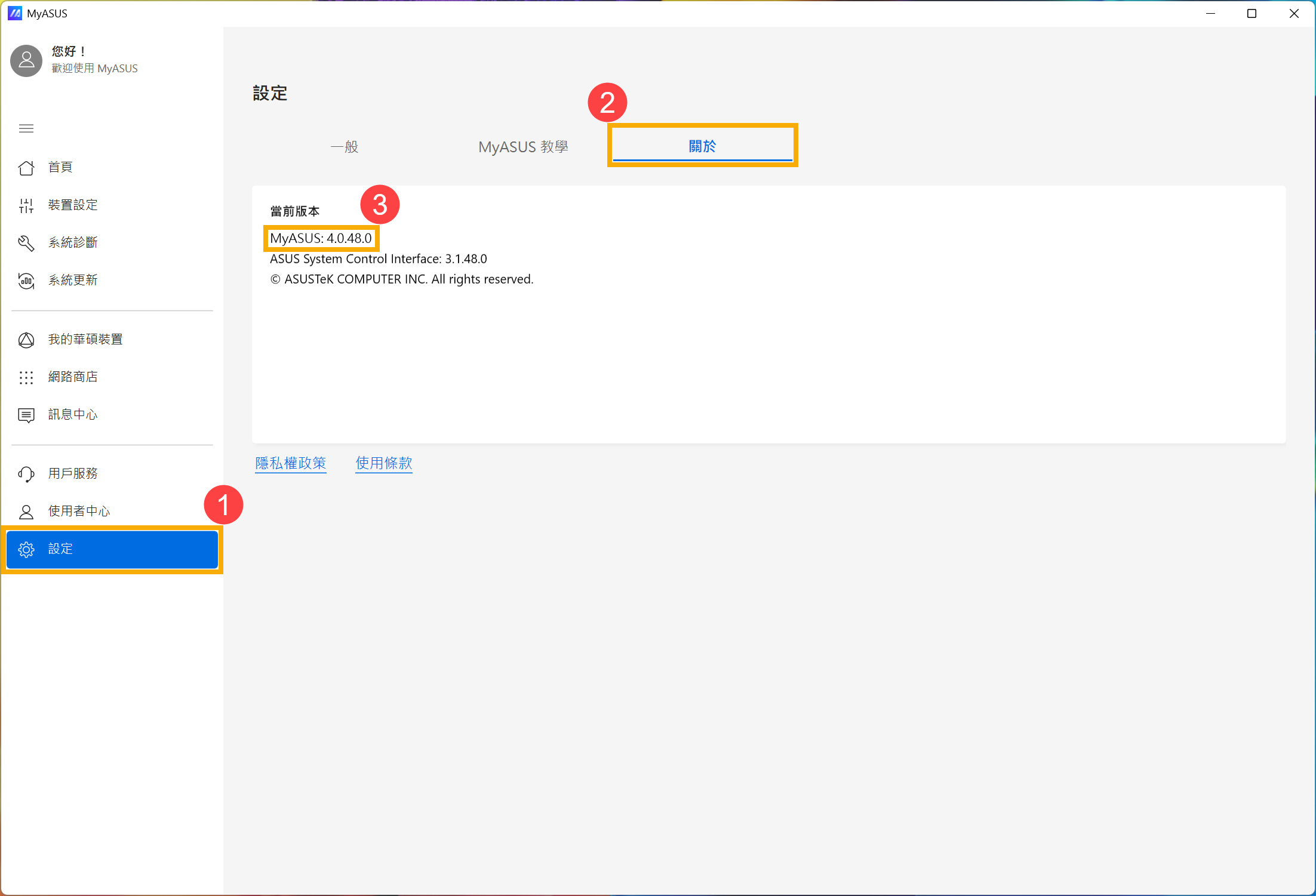 答案一:請至左側選單點選下方的[設定]①,然後點選界面上排的[關於]②,即可在當前版本確認所安裝的MyASUS版本③。