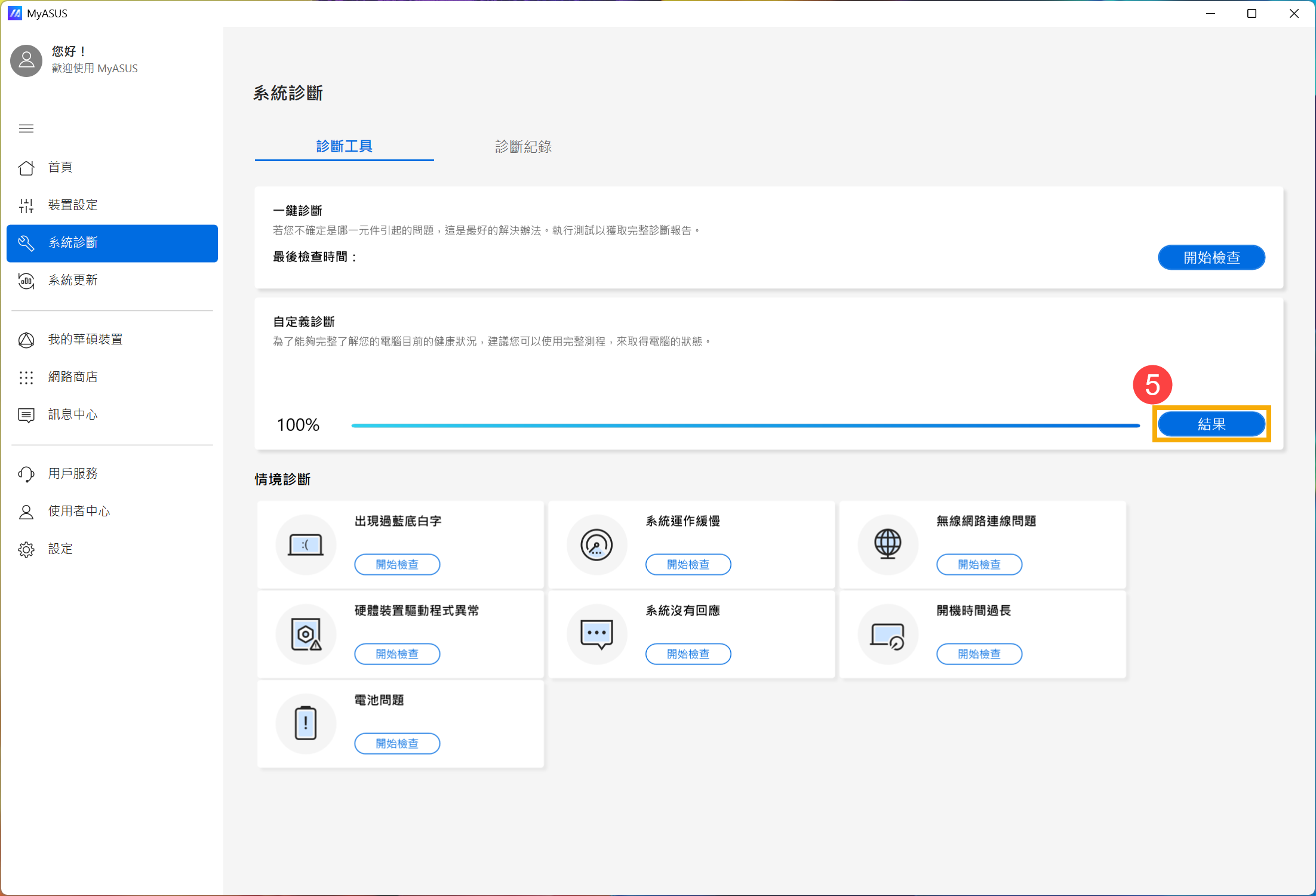 每個項目所需的時間不同,最多可能會需要花費數分鐘,請耐心等候。 - 檢測完成後請點選[結果]⑤。