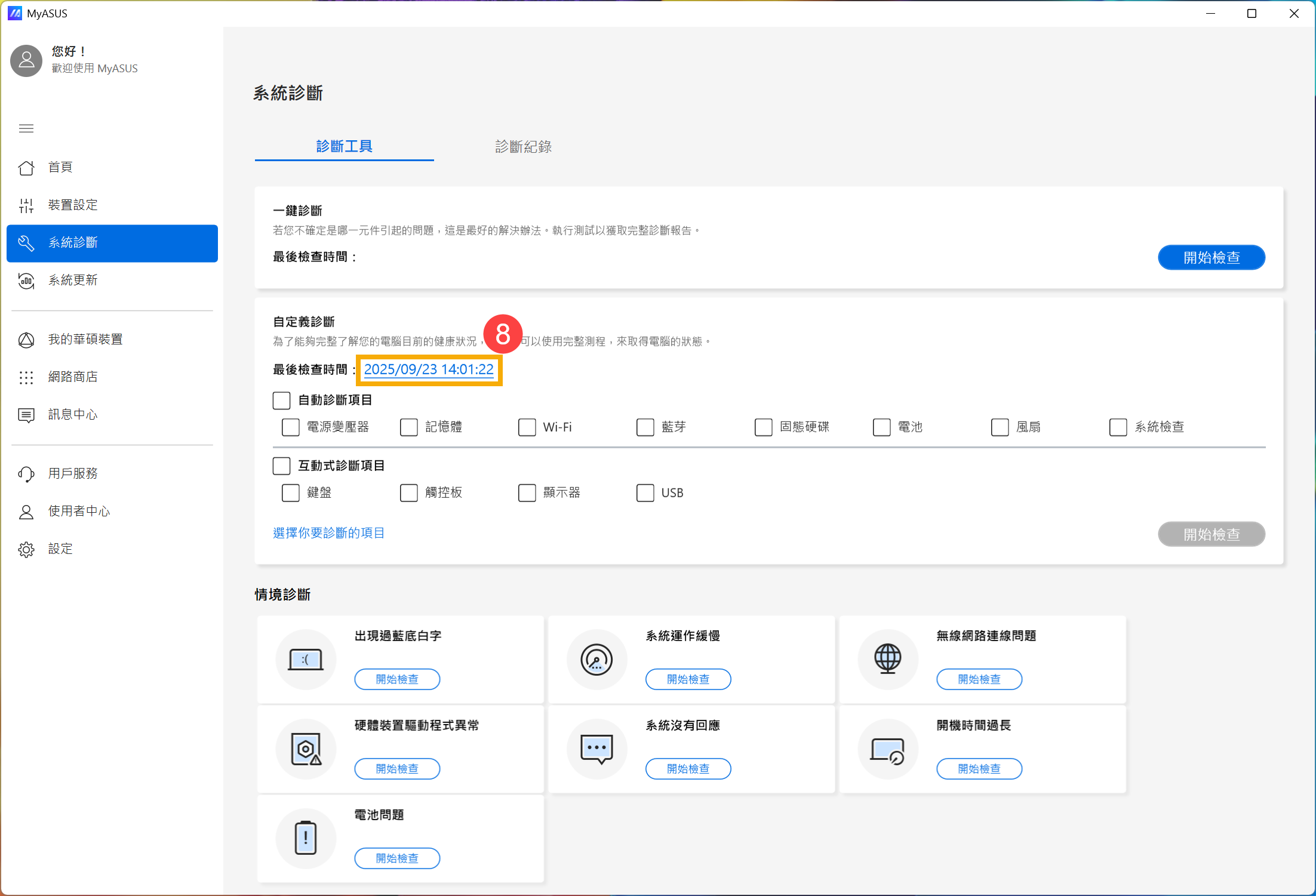 註:某些情況下,執行Windows Update後可能會出現BitLocker修復畫面(BitLocker recovery)。建議您在執行Windows Update之前,先儲存BitLocker修復金鑰,或是關閉BitLocker加密。請參考這篇文章以了解更多資訊:https://www.asus.com/tw/support/FAQ/1042922/。 - 您還可以點擊[最後檢查時間]⑧來查看上次的診斷結果。