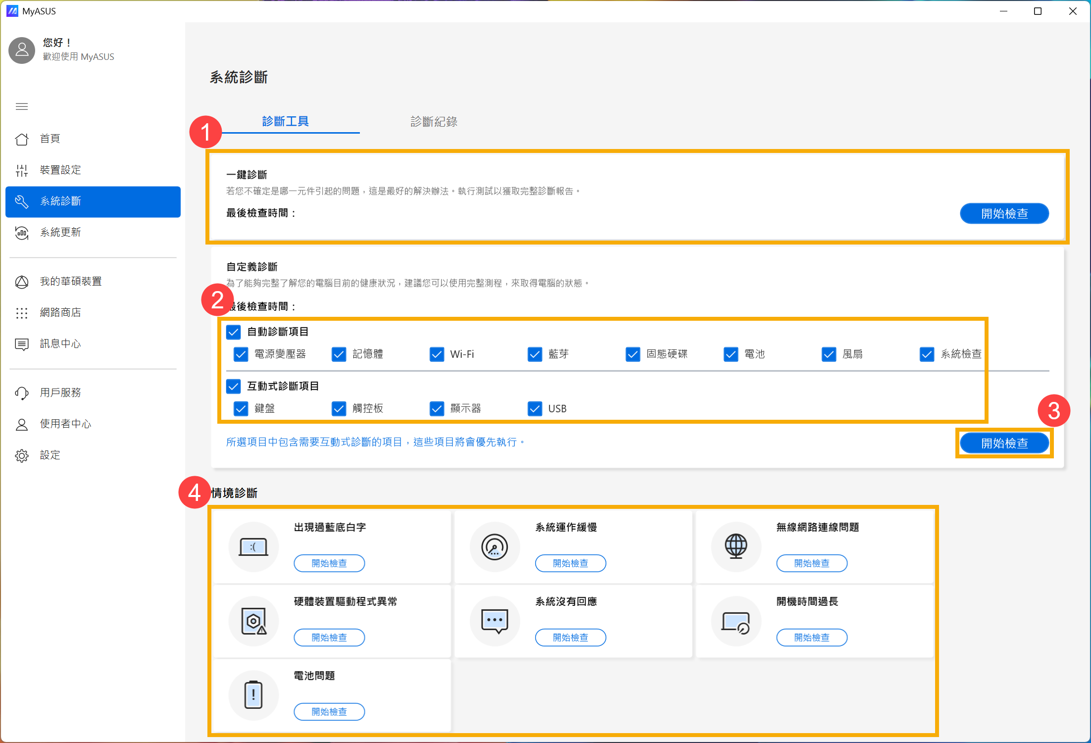 - 這裡有三種方式可以進行系統檢測。您可以選擇一鍵診斷①、在自定義診斷中選擇要檢查的項目②,然後點擊[開始檢查]③。或者,點擊情境診斷下面的任何一個情境④,以獲得有關檢查項目的更多詳細信息(以下以自定義診斷為例)。
