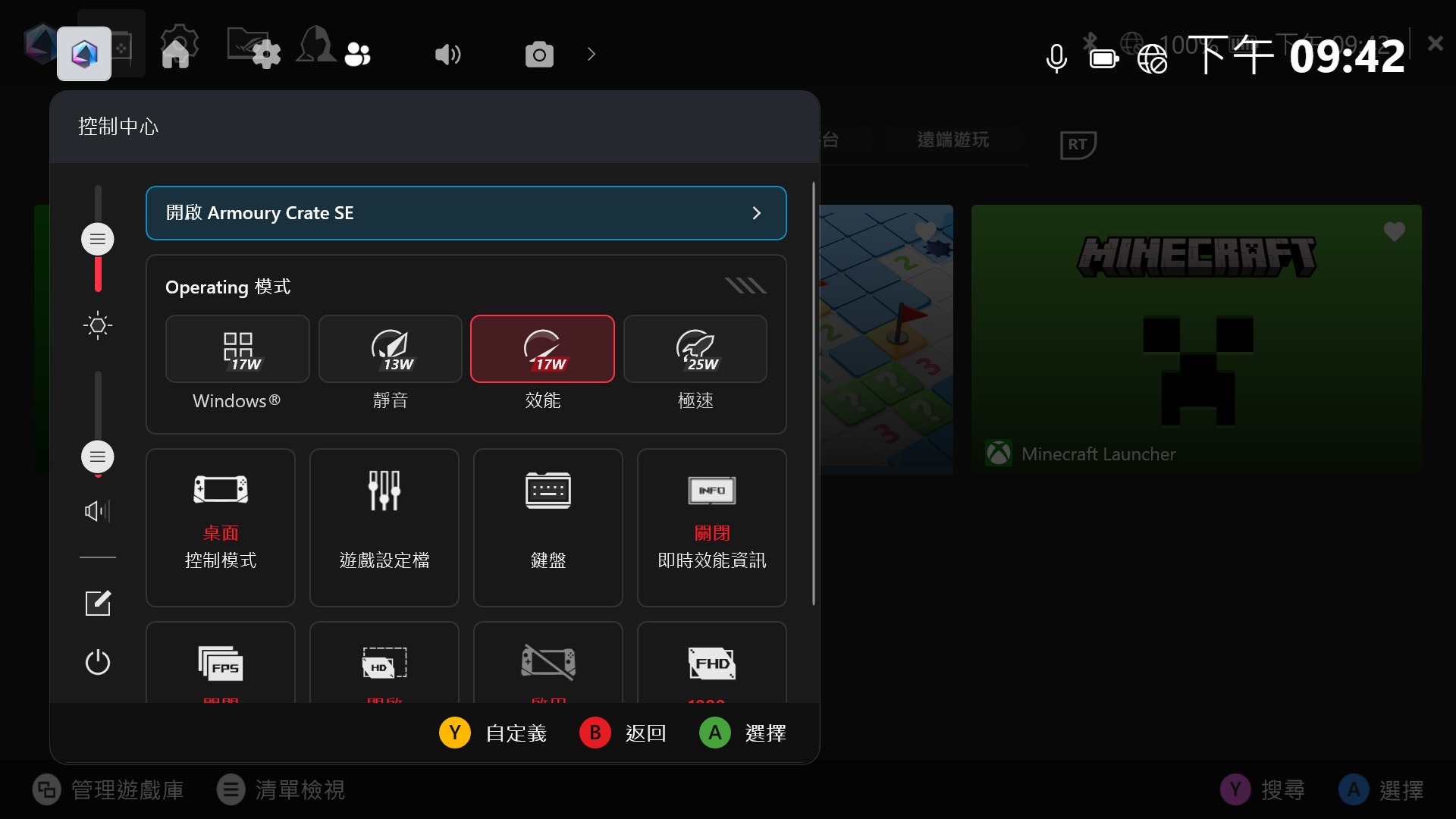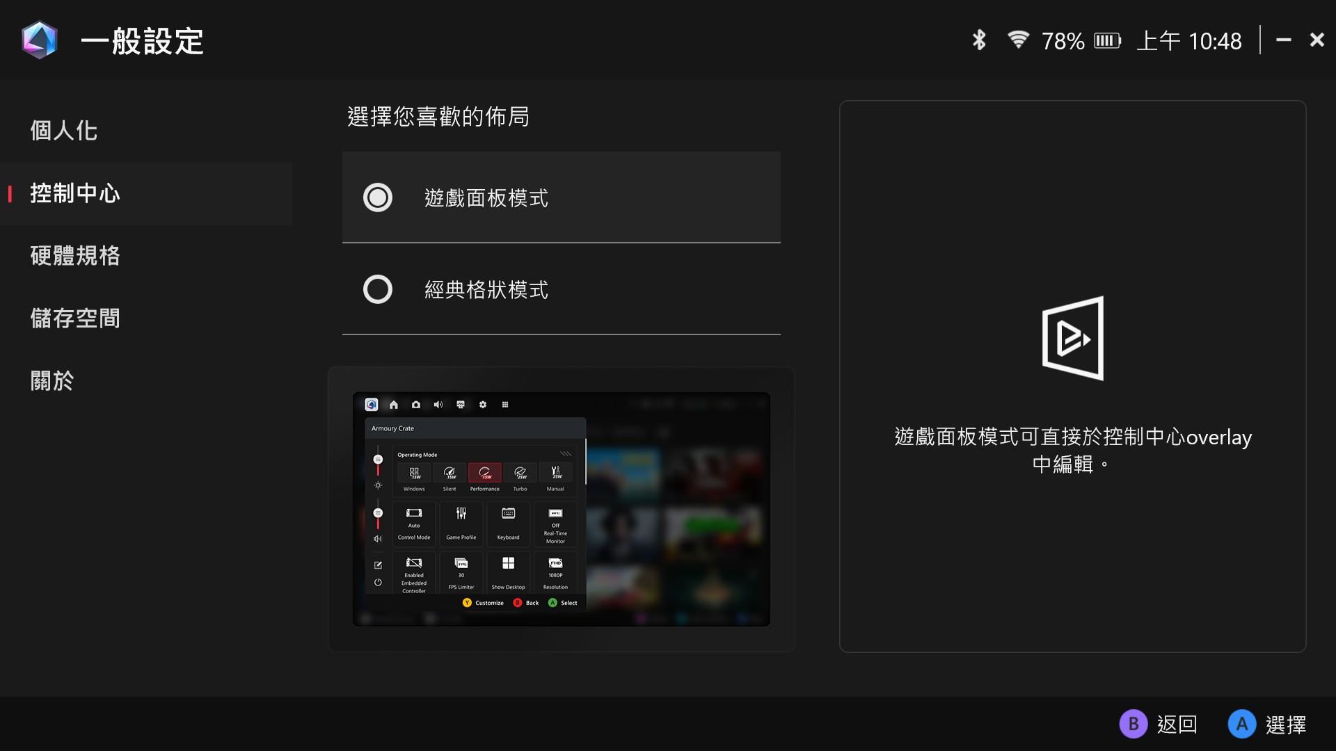 應用程式ARMORY CRATE SE為主要控制和優化 ROG Ally 產品的軟體整合平台,它為玩家提供簡單的操作介面讓操控ROG Ally更加輕鬆,其包含遊戲收藏庫管理、控制模式的配置、RGB燈光特效調整和即時查看系統信息。Aromury Crate SE也為您的ROG Ally 提供多種個人化設置,如裝置按鈕和搖桿功能的設定或控制中心的編輯。