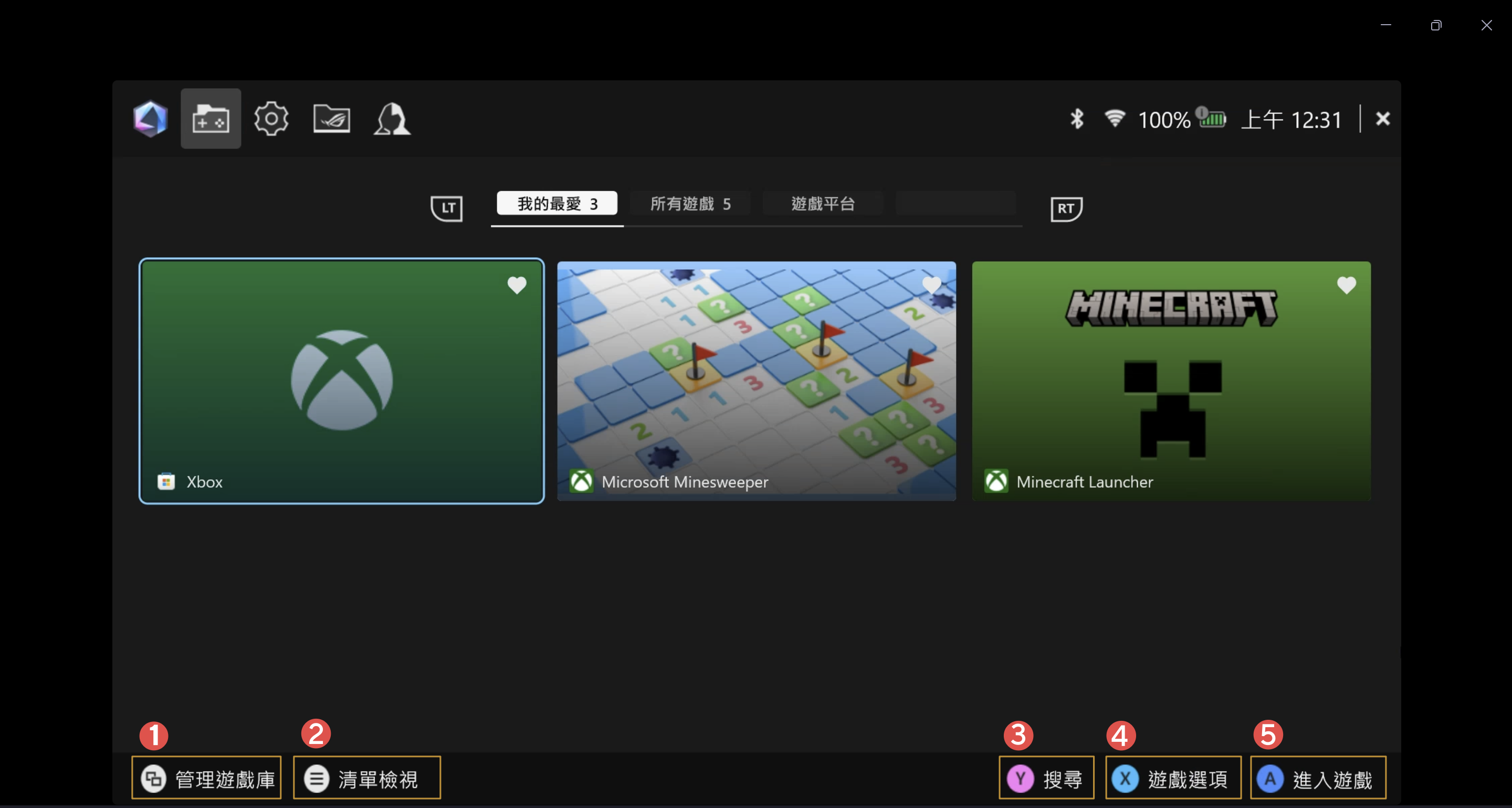 呈現玩家所安裝或選擇的遊戲及應用程式,並管理遊戲庫和編輯遊戲選項,而透過左右板機鍵玩家可以進行我的最愛和遊戲平台的頁面切換。
