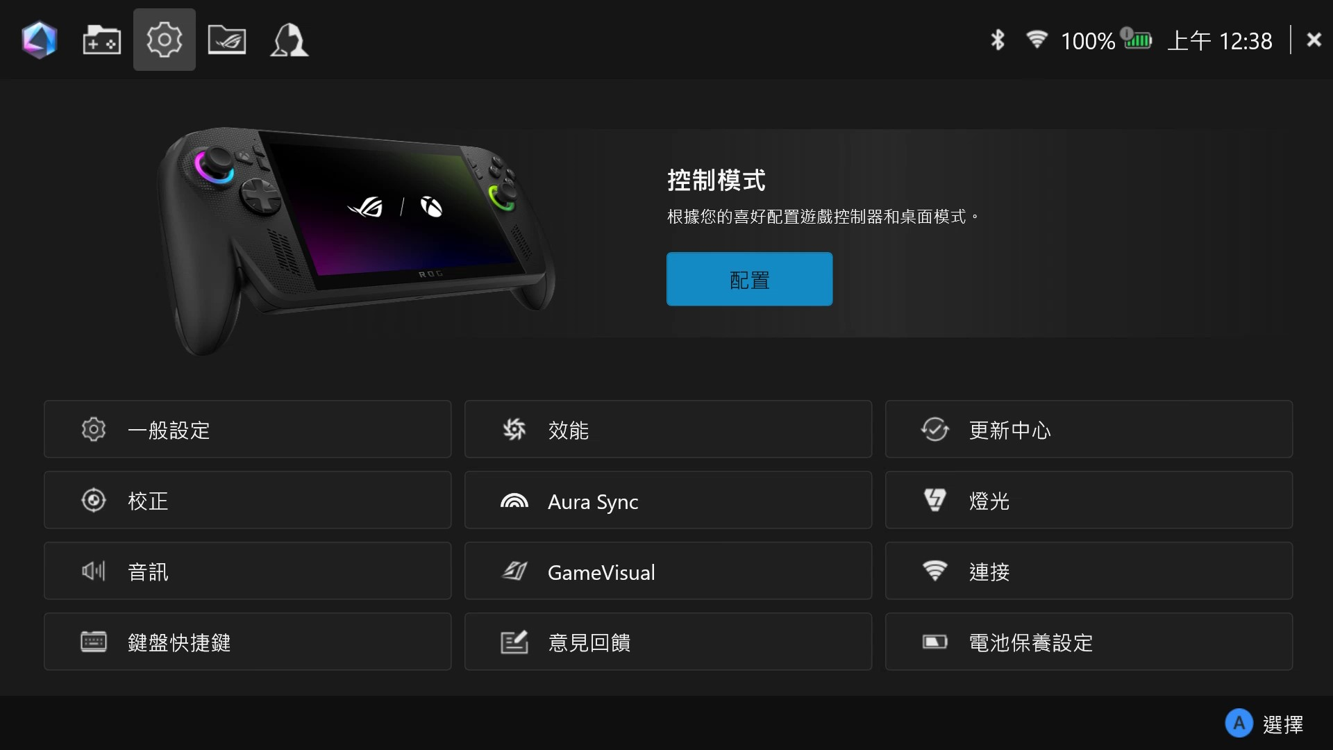 裝置中各項常用功能的設定區域,如一般設定、效能、更新中心、校正、Aura Sync、燈光、音訊、Game Visual、連接、鍵盤快捷鍵、意見回饋、電池保養設定。