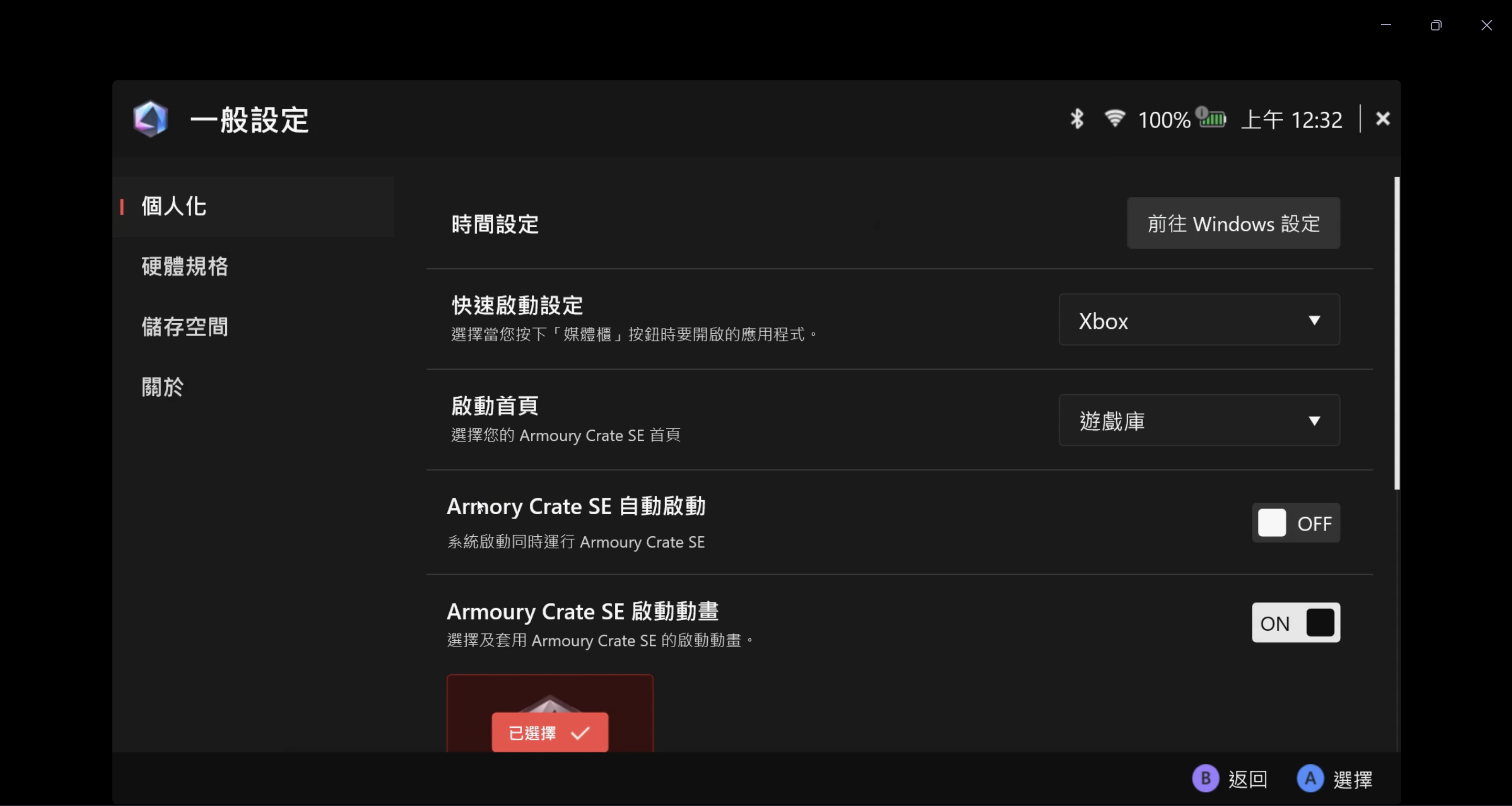 一般設定: 玩家可以在個人化中設定Armourt Crate SE的啟動動畫或介面主題,並確認裝置中的硬體規格和內部儲存空間。在關於的項目中,將顯示Armoury Crate SE應用程式版本、服務版本、APP診斷工具。
