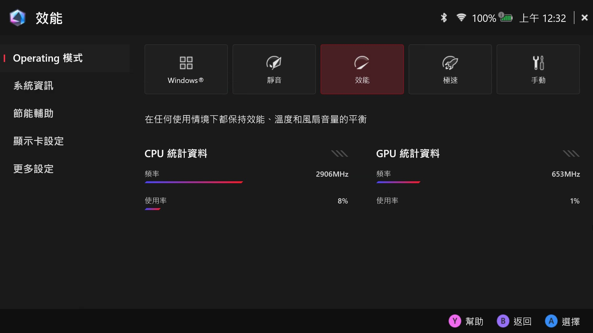 效能: 提供玩家快速簡易的效能模式調整,並確認裝置中的系統相關資訊。更多的節能輔助功能和顯示卡設定也都可以在效能中調整。