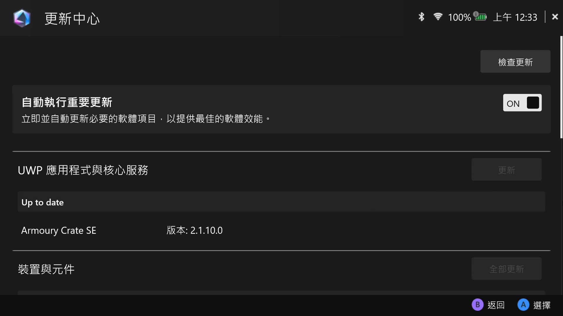 更新中心: 點選[檢查更新],更新中心會列出應用程式中需要更新的韌體或應用程式由玩家自行選擇更新。