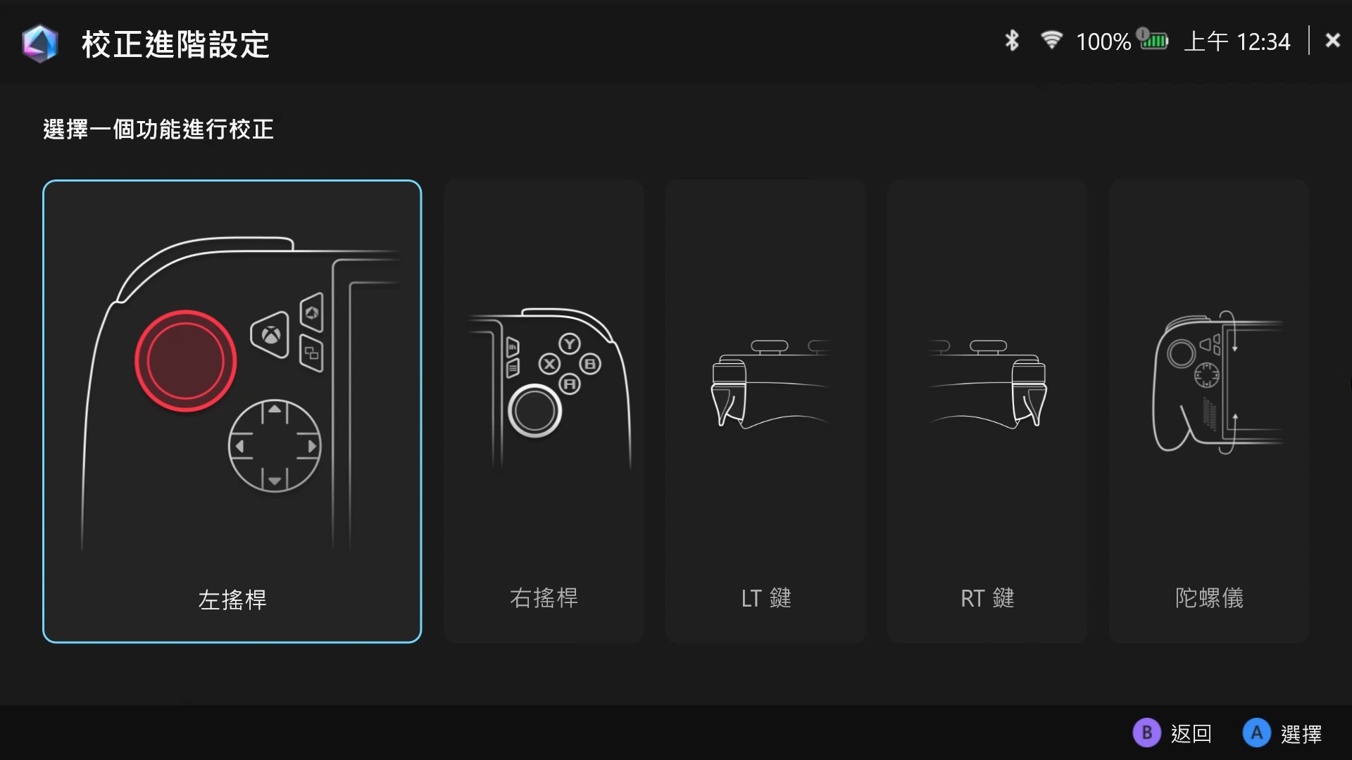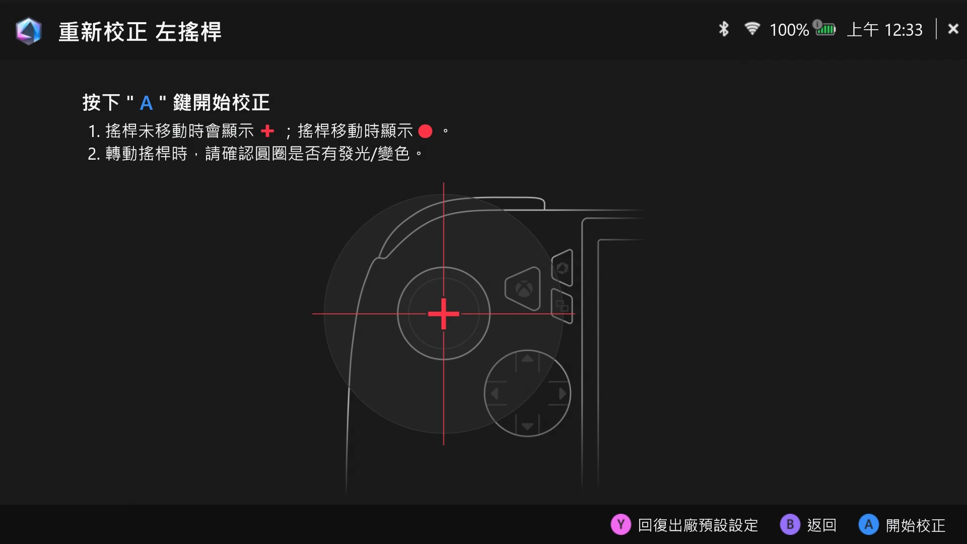 搖桿校正,按下 [A鍵] 開始搖桿校正,之後請依照指示進行校正。