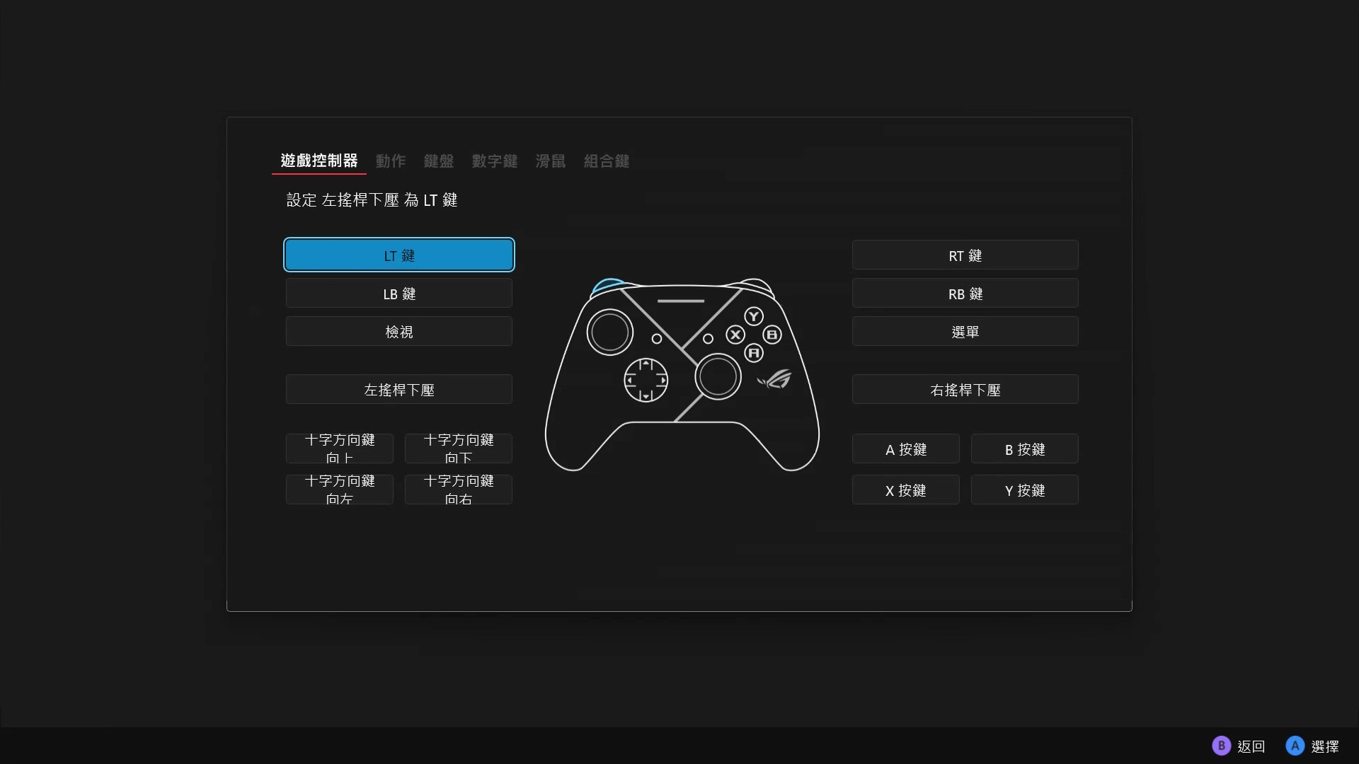 按鍵功能設定: 重新設置按鍵功能並提供六款指令類型如遊戲手把、動作、鍵盤、數字鍵、滑鼠和組合鍵。