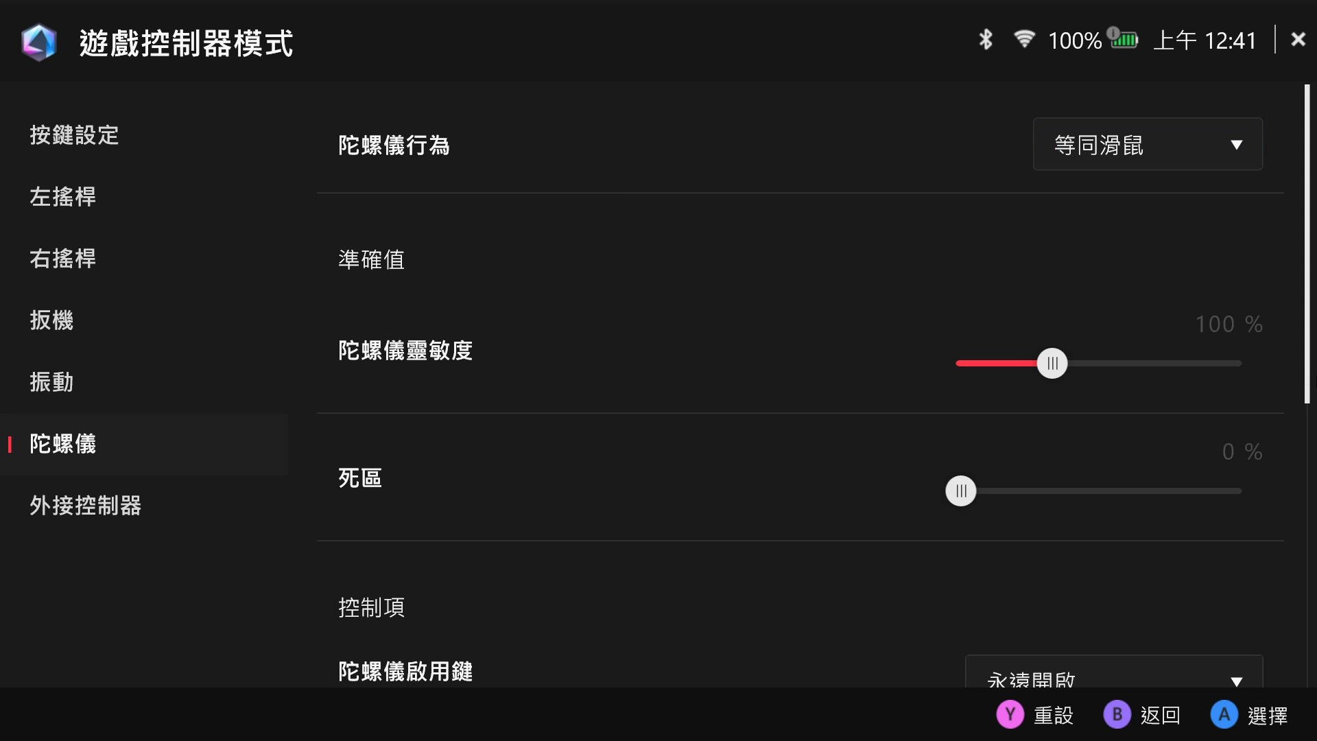 反感應死區,許多遊戲有預設控制器的感應死區,若感覺部分移動操作在遊戲中無作用,反感應死區的調整可以縮小遊戲中預設的感應死區。