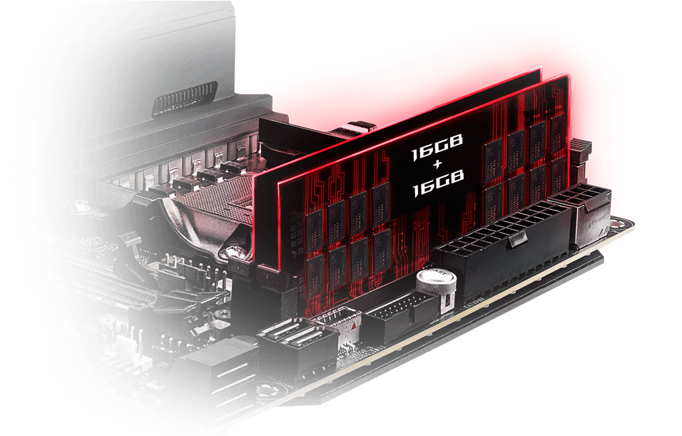 Crosshair VIII Impactは、メモリ総容量64GBに対してスロットあたり最大32GBまで対応できる独自のメモリトレース設計を備えています。2倍の容量のUDIMMモジュールを備えたCrosshair VIII Impactは、コンパクトなデュアルDIMM設計でDIMM4枚分のメモリ容量を実現します。