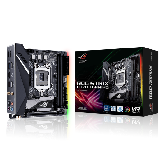 Intel H370 mini-ITX gaming motherboard with Aura Sync RGB LED lighting, Intel 802.11ac Wi-Fi, pre-mounted I/O shield, dual M.2, SATA 6Gbps, USB 3.1 and HDMI.