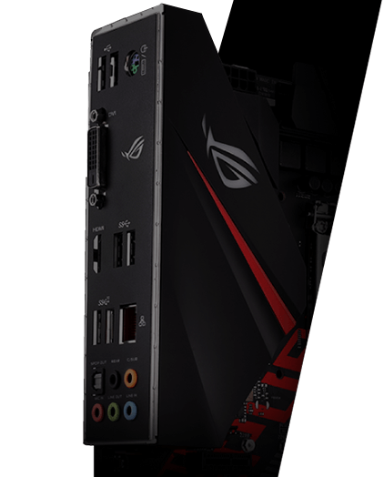 ROG's patent-pending I/O shield is finished in sleek matte black, and it’s pre-mounted to make it easy to install the motherboard.
