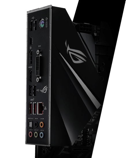 ROG's patent-pending I/O shield is finished in sleek matte black, and it’s pre-mounted to make it easy to install the motherboard.