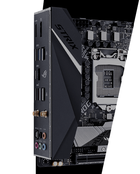 ROG's patent-pending I/O shield is finished in sleek matte black, and it’s pre-mounted to make it easy to install the motherboard.