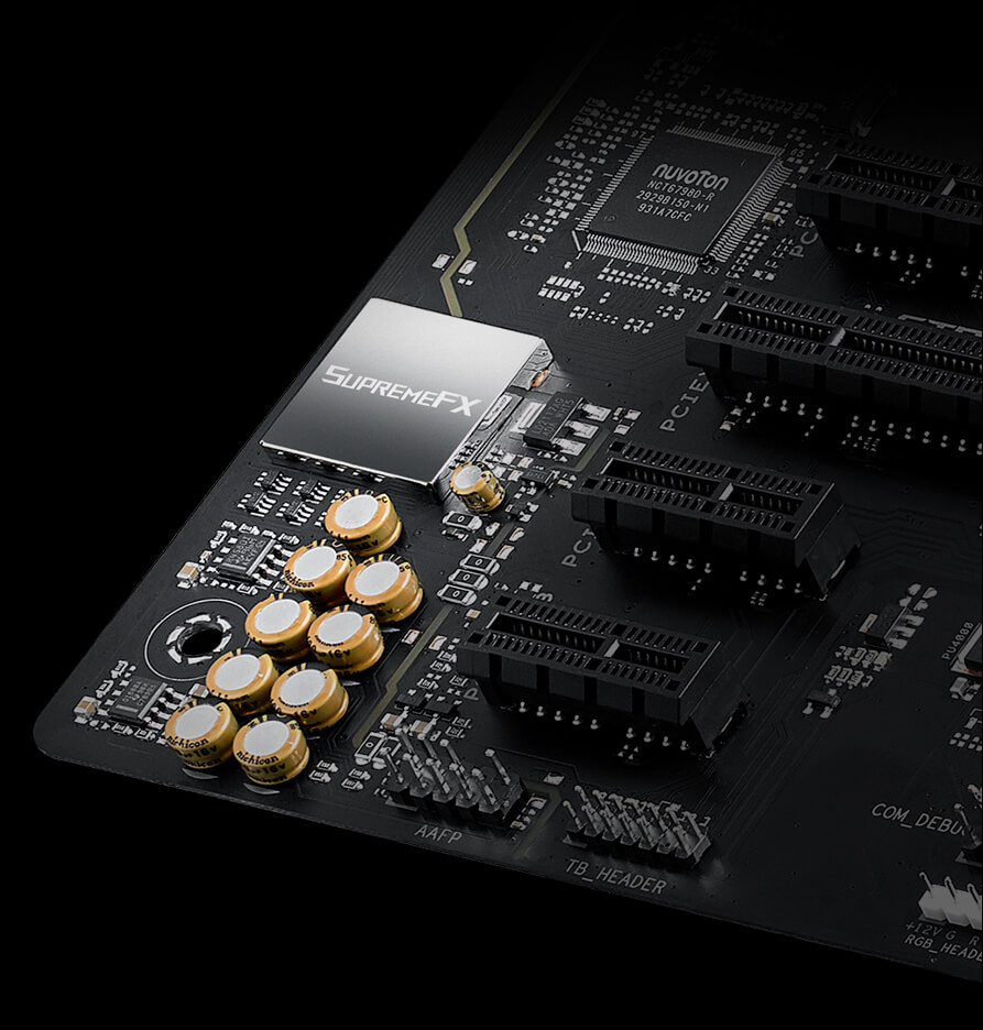 Zabudovaná zvuková technológia ROG SupremeFX zabezpečuje ROG Strix B550-F prvotriedny zvuk. Okrem zabezpečenia plochej frekvenčnej odozvy pre neutrálny a podrobný zvukový podpis ponúka dva výstupy na prednom paneli riadené operačnými zosilňovačmi, ktoré poskytujú vysoko kvalitný zvuk herným headsetom.