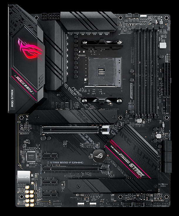 Základné dosky radu ROG Strix B550 Gaming ponúkajú súpravu funkcií obvykle patriace do vyššej úrovne radu ROG Strix X570 Gaming, vrátane najnovšieho pripojenia PCIe® 4.0. Vďaka robustnému napájaniu a účinnému chladeniu je ROG Strix B550 Gaming dokonale vybavená na spoluprácu s 3. generáciou AMD Ryzen™ procesorov. ROG Strix B550-F Gaming sa môže pochváliť futuristickou estetikou a intuitívnym softvérom ROG, ktoré vašej zostave dodajú herné výhody.