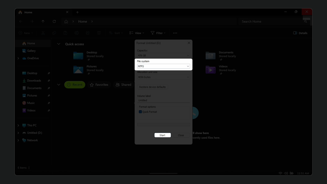 7. Select [NTFS] in the File system dropdown menu. Select [Start] to begin formatting.
