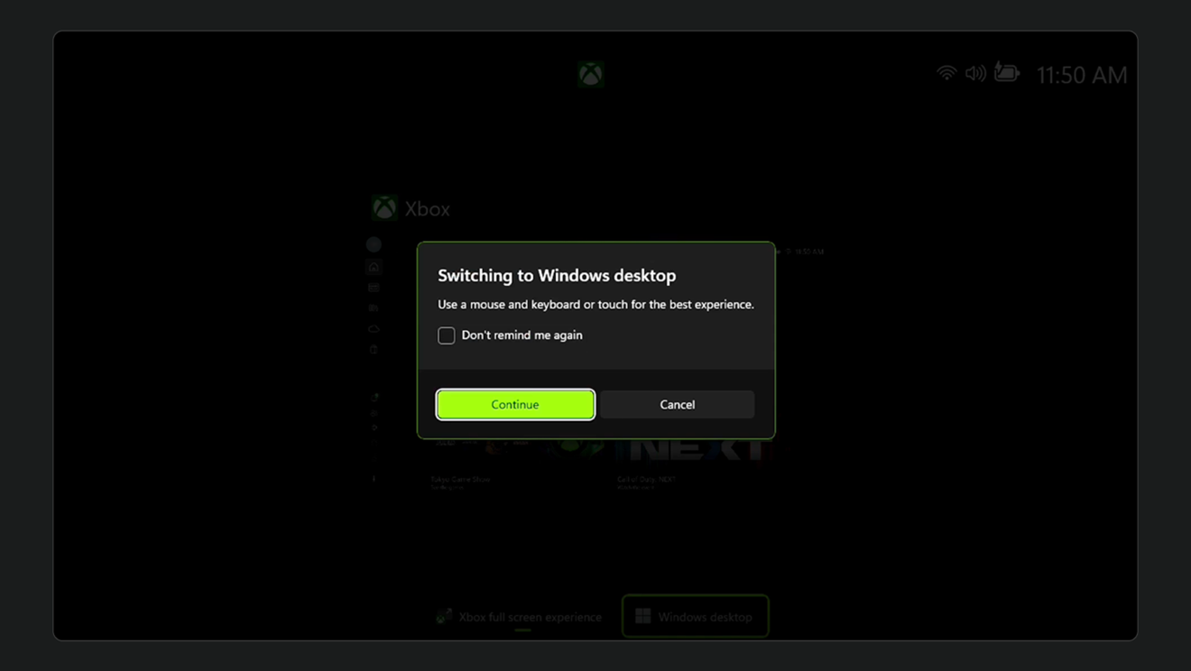 NOTE: If you switched to Windows desktop mode, it is recommended to restart your device to return to the Xbox full screen experience.