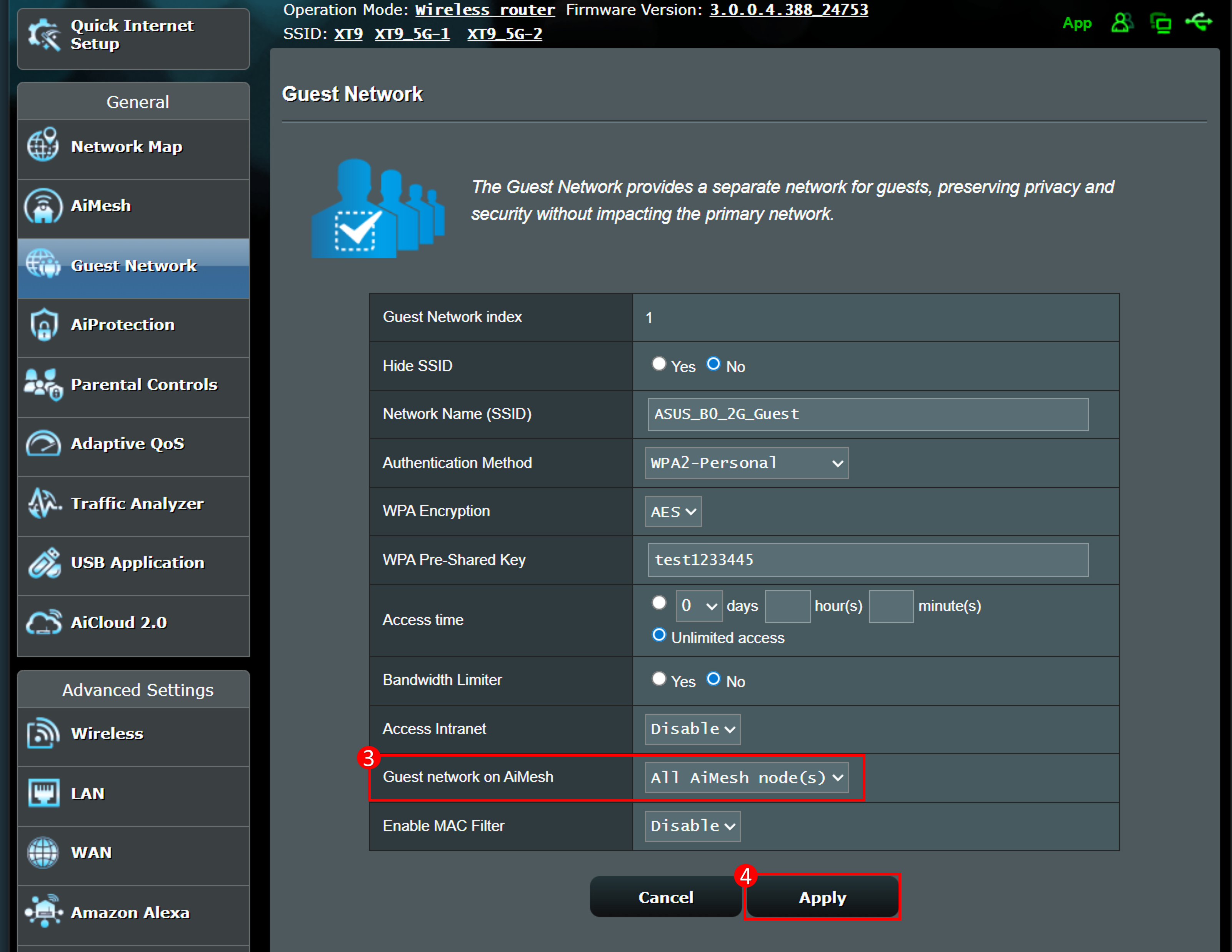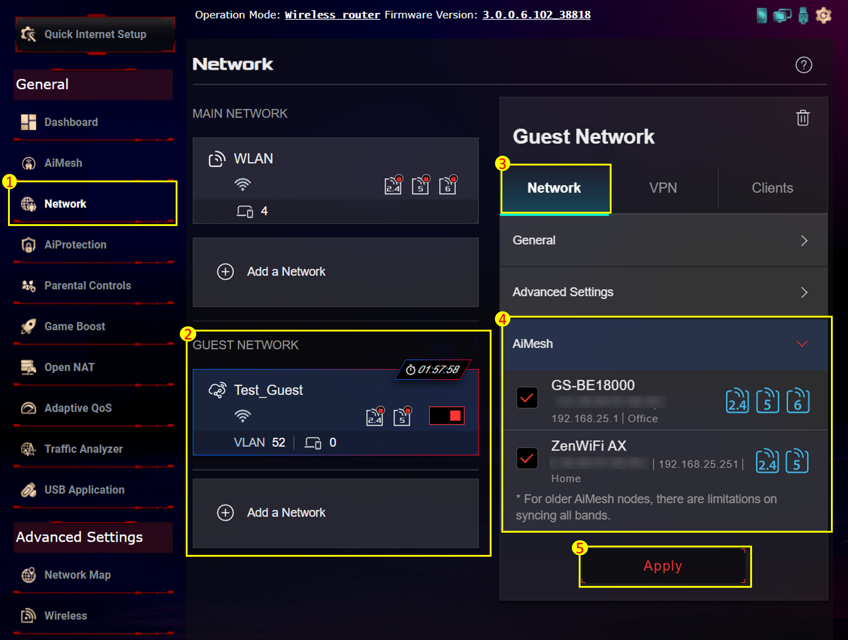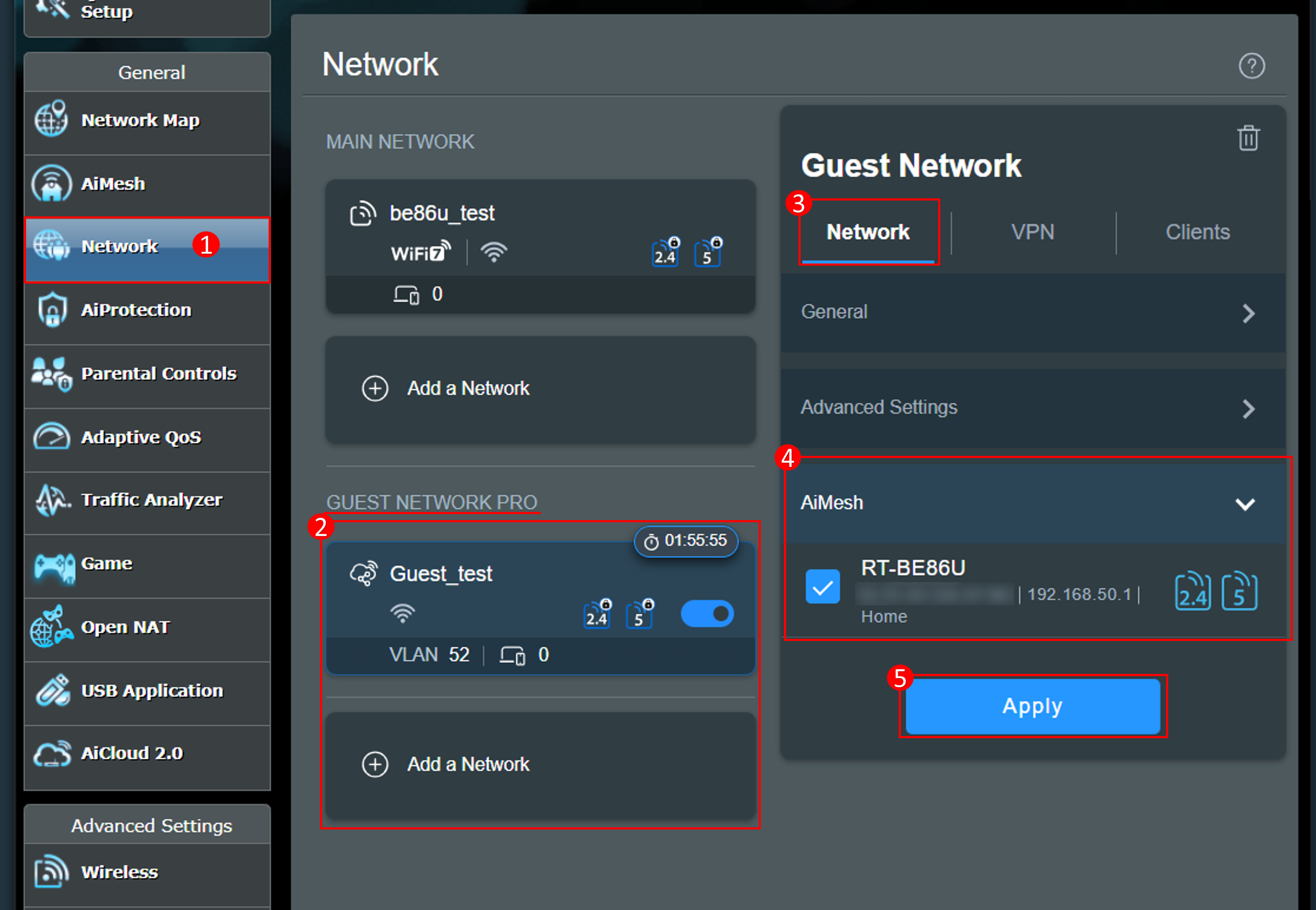 2. This feature can only be configured on the AiMesh router. Guest network is currently designed to allow the first set of each band (2.4G, 5G, 5G-1) available to the AiMesh node. Only one set is available for each band.