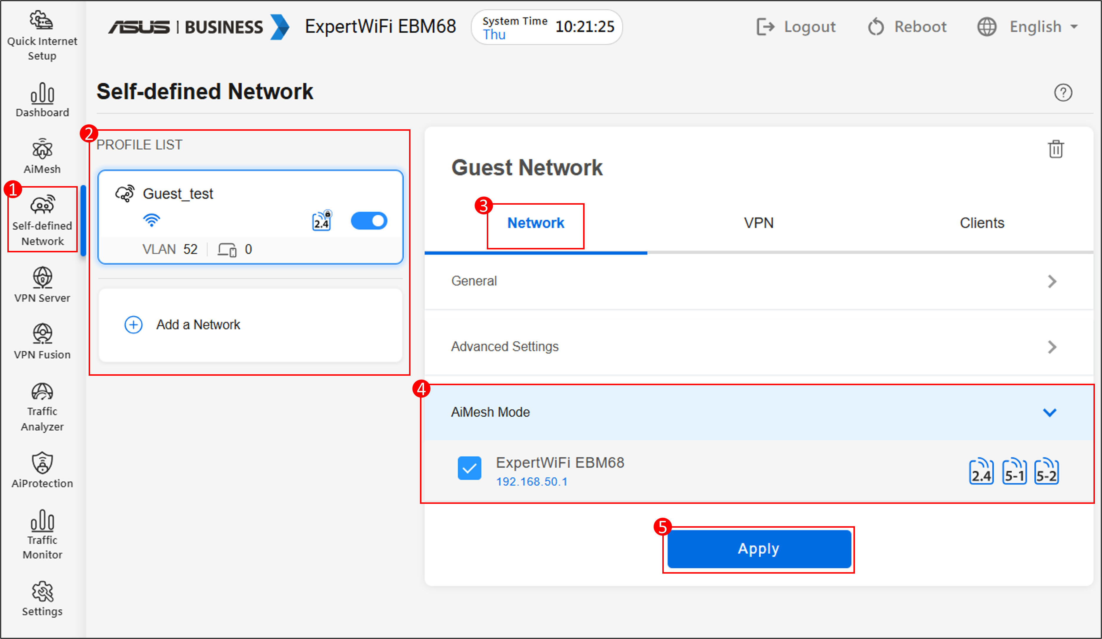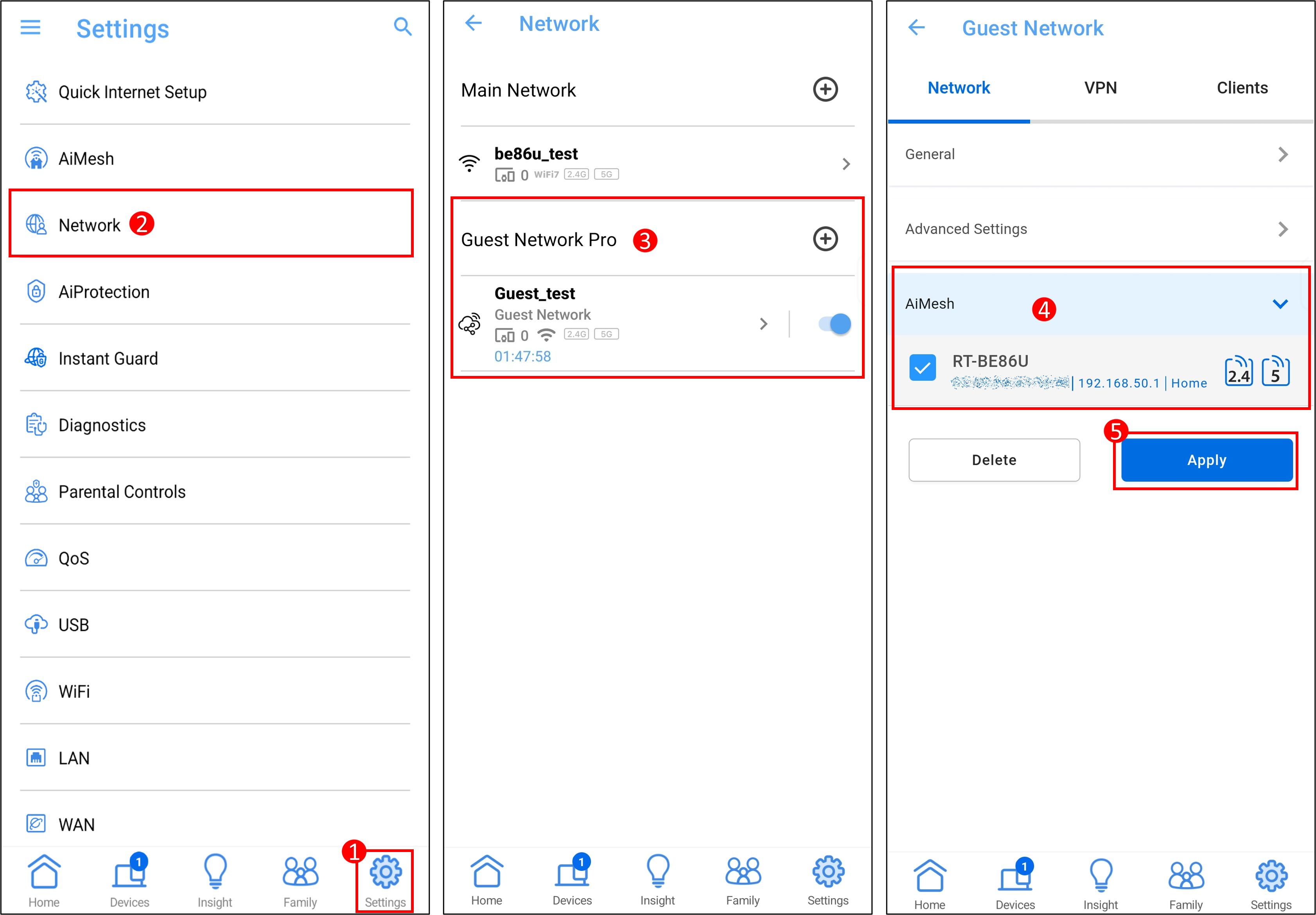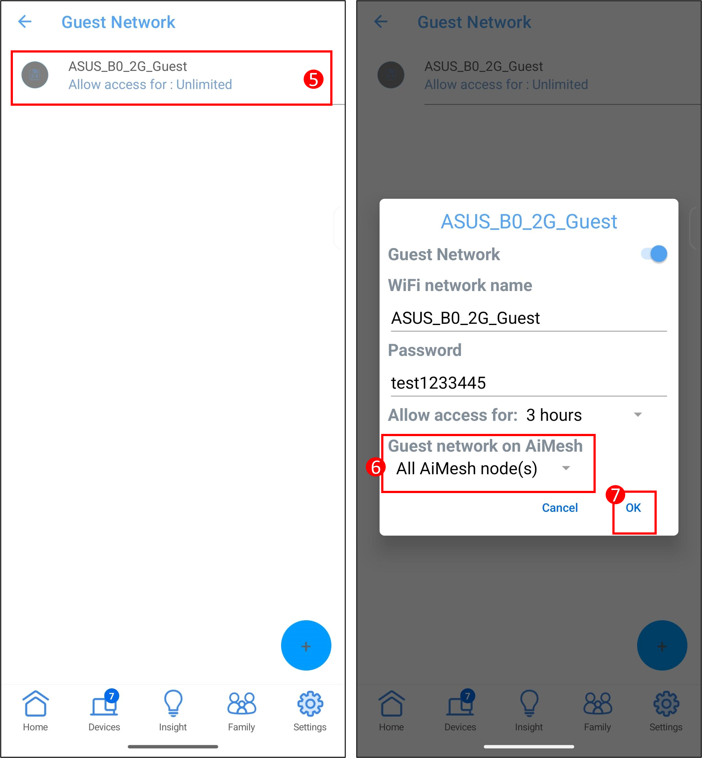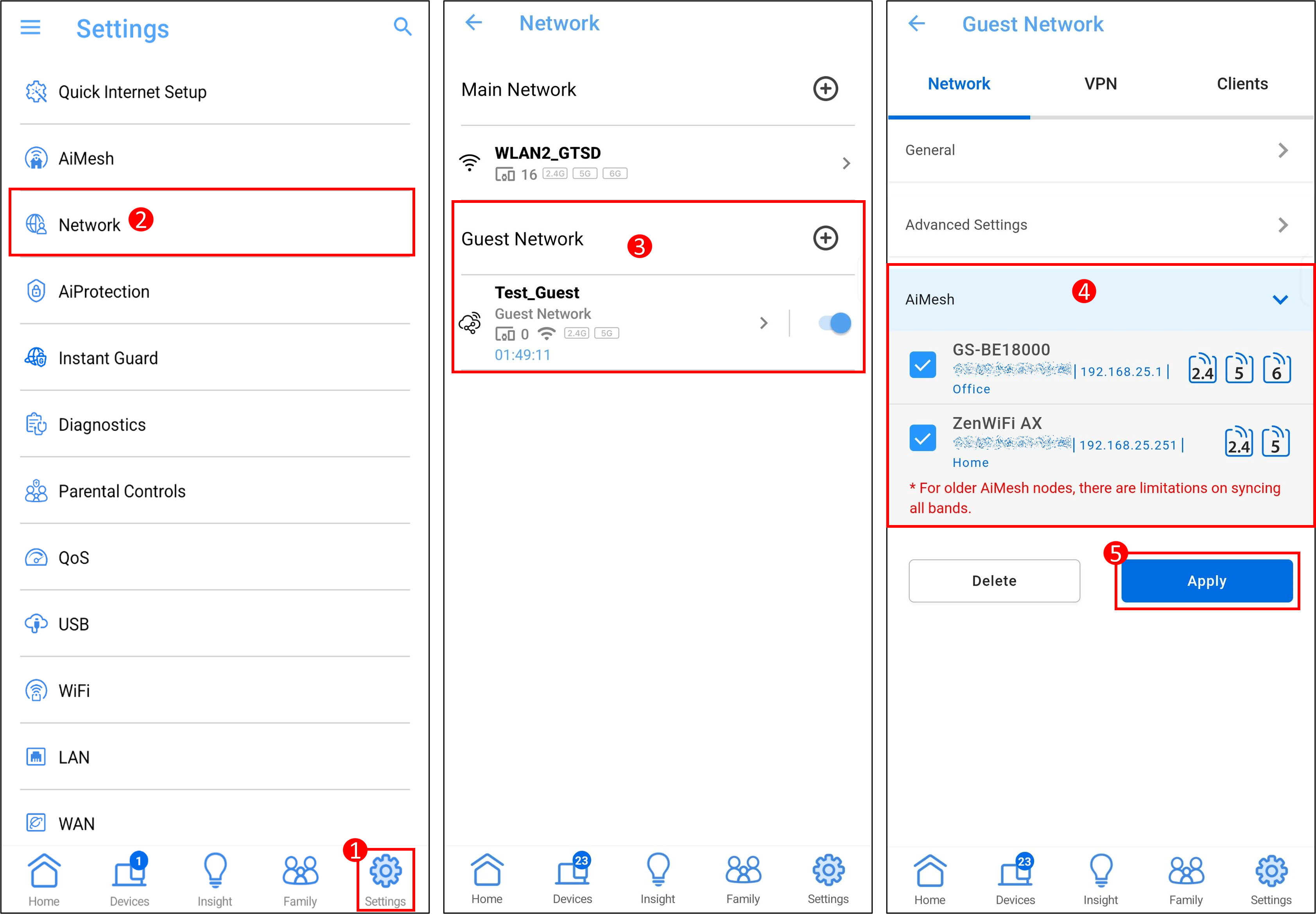 2. This feature can only be configured on the AiMesh router. Guest network is currently designed to allow the first set of each band (2.4G, 5G, 5G-1) available to the AiMesh node. Only one set is available for each band.