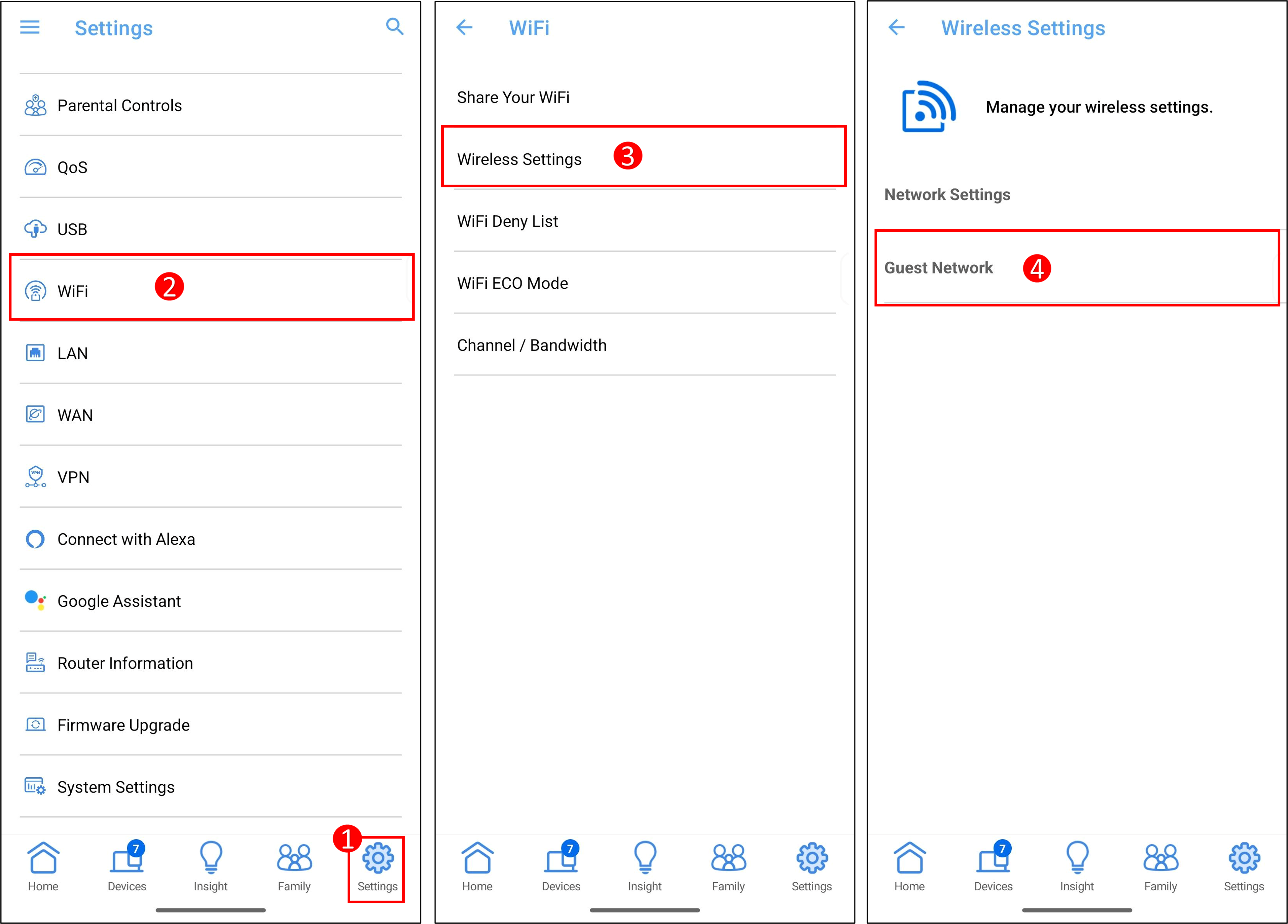 Step 1: Login to App and tap [ Settings ] > [ WiFi ] > [ Wireless Settings ] > [ Guest Network ], create a new network on the guest network or access the guest network's profile.
