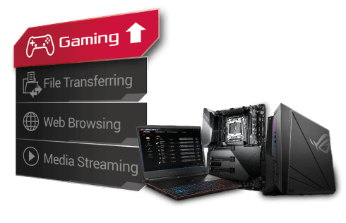 ROG PCs (motherboard, laptop, desktops) and ROG wifi routers together with Game First V network acceleration software ensure smoother online game with lower ping and less lag. No matter wire or wireless, Game First and Game Boost prioritize gaming packets and decrease so that you do not miss a bullet from the back.